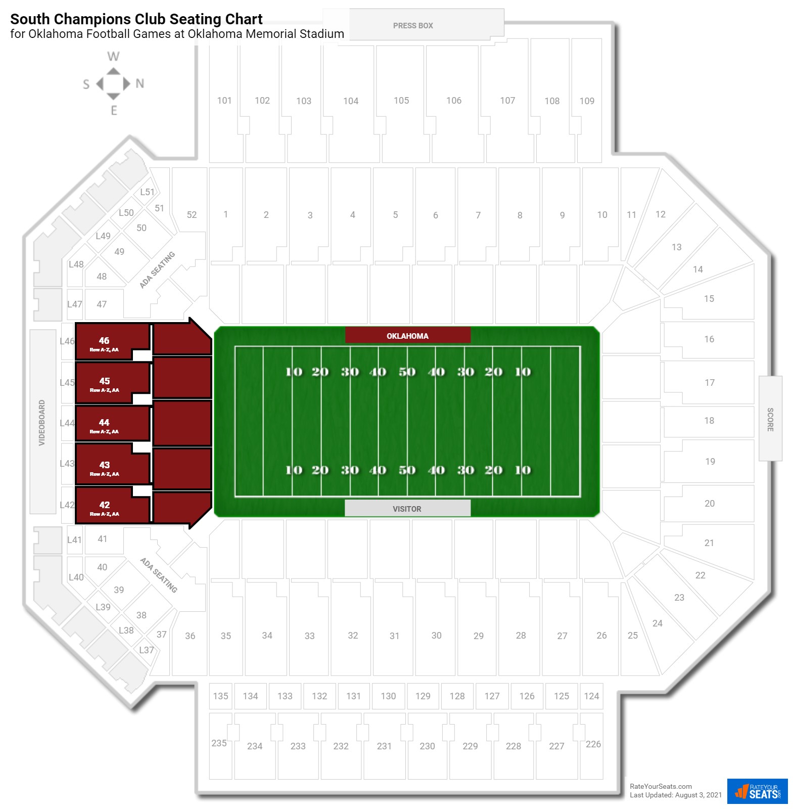 Popular before the game and during halftime, the South Lounge is the most modern club at Oklahoma Memorial Stadium. The space is located just above South Club seats and features plenty of seating for enjoying a full meal or a drink. This is an important touch because these seats are all-inclusive - food and soft drinks are included with the price of your ticket.