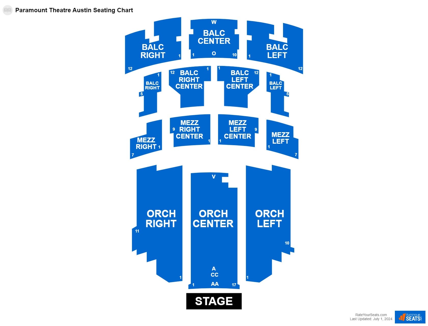 This seating chart represents the seating layout for most events at Paramount Theatre Austin. Click the map and then select your event to use an interactive map for your exact event.