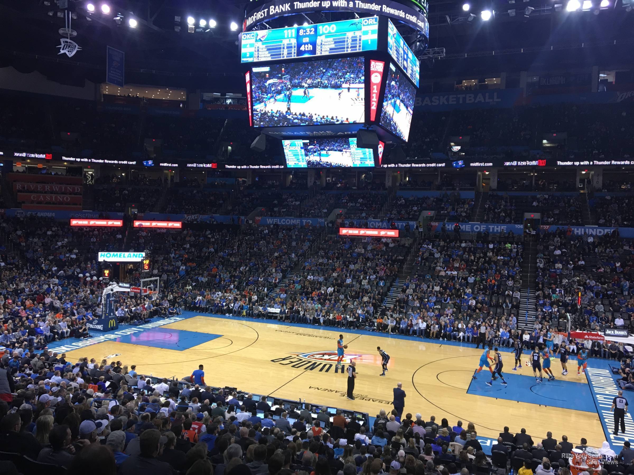 -Consistently among the most expensive options for basketball games at Paycom Center, the views from the Lower Level Sideline section can be difficult to beat especially in the seats closest to center court in Sections 105-106 and 115-116. Each section begins with the ultra premium Courtside Club seats at the very front (found in the rows labeled FL1, FL2, FL3, and FL4). Fans there are treated to a one of kind of experience in the Courtside areas, with premium amenities and unforgettably close views. You can even sit beside the Thunder team bench in Rows FL1-FL2 of Section 116, or beside the visiting team bench in Rows FL1-FL2 of Section 115. Behind the Courtside seats, the sections continue with up to 20 lettered rows of seating, and entry tunnels located above the last row. If you are priced out from getting a seat in the low rows close to the team benches, we recommend searching for tickets in the last few rows of Sections 105-106 where you'll be close to the entry tunnel, have an excellent seating height, and head-on views of the teams on their benches.
