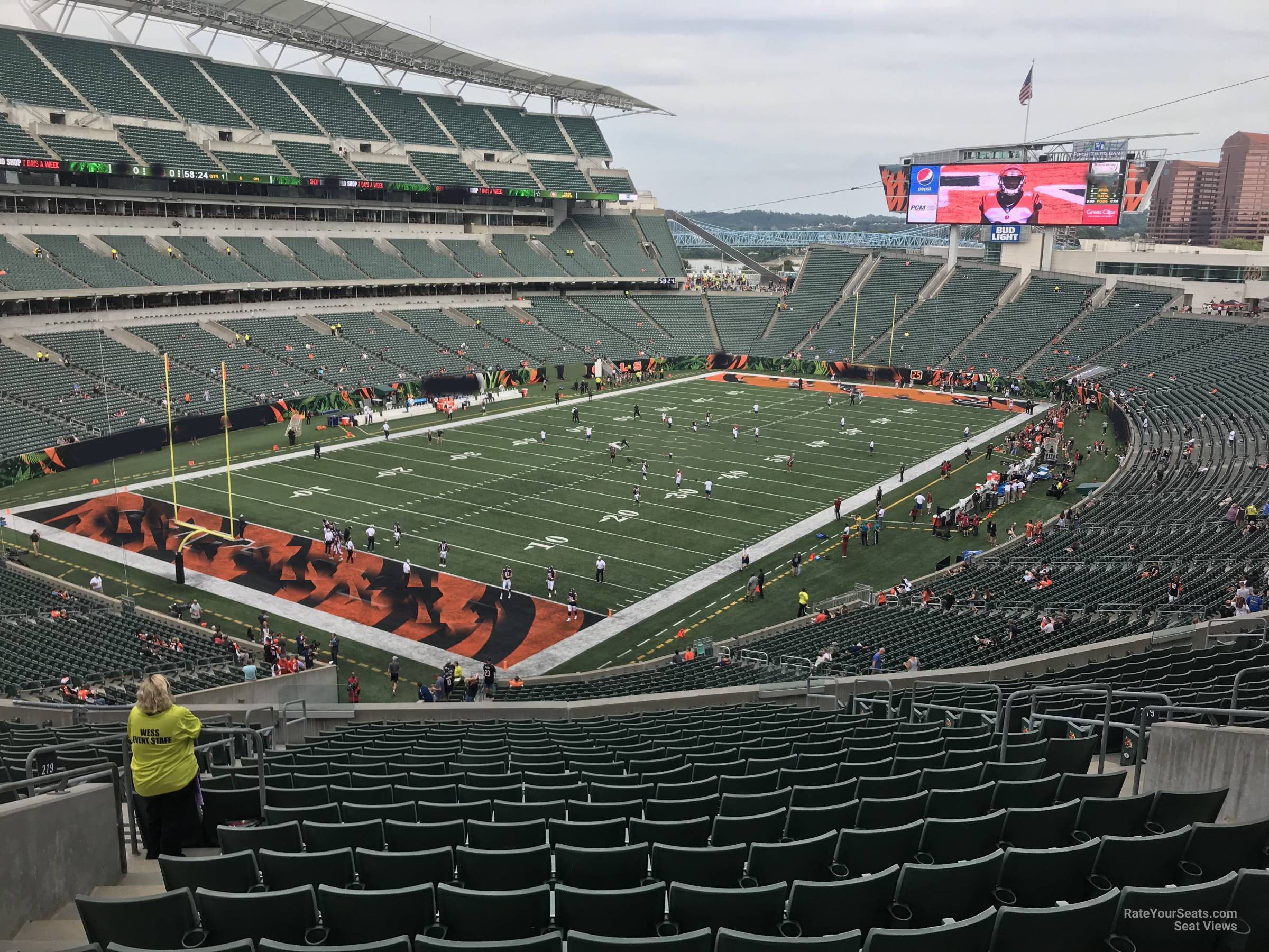 -200 Level corner seats are directly beside the club level seats on the Bengals seating chart, but do not receive the same special amenities. Even though they do not get the same benefits, these seats still have a good elevated view of the action on the field. The positioning of the location in the corner gives a perfect angle to see scoring plays occur in the near endzone. The sections in this location have 20-32 numbered rows with the section tunnel located near row 12. Fans seated rows 20 and above in sections 202, 232 and 248 will be covered by the upper deck overhang.