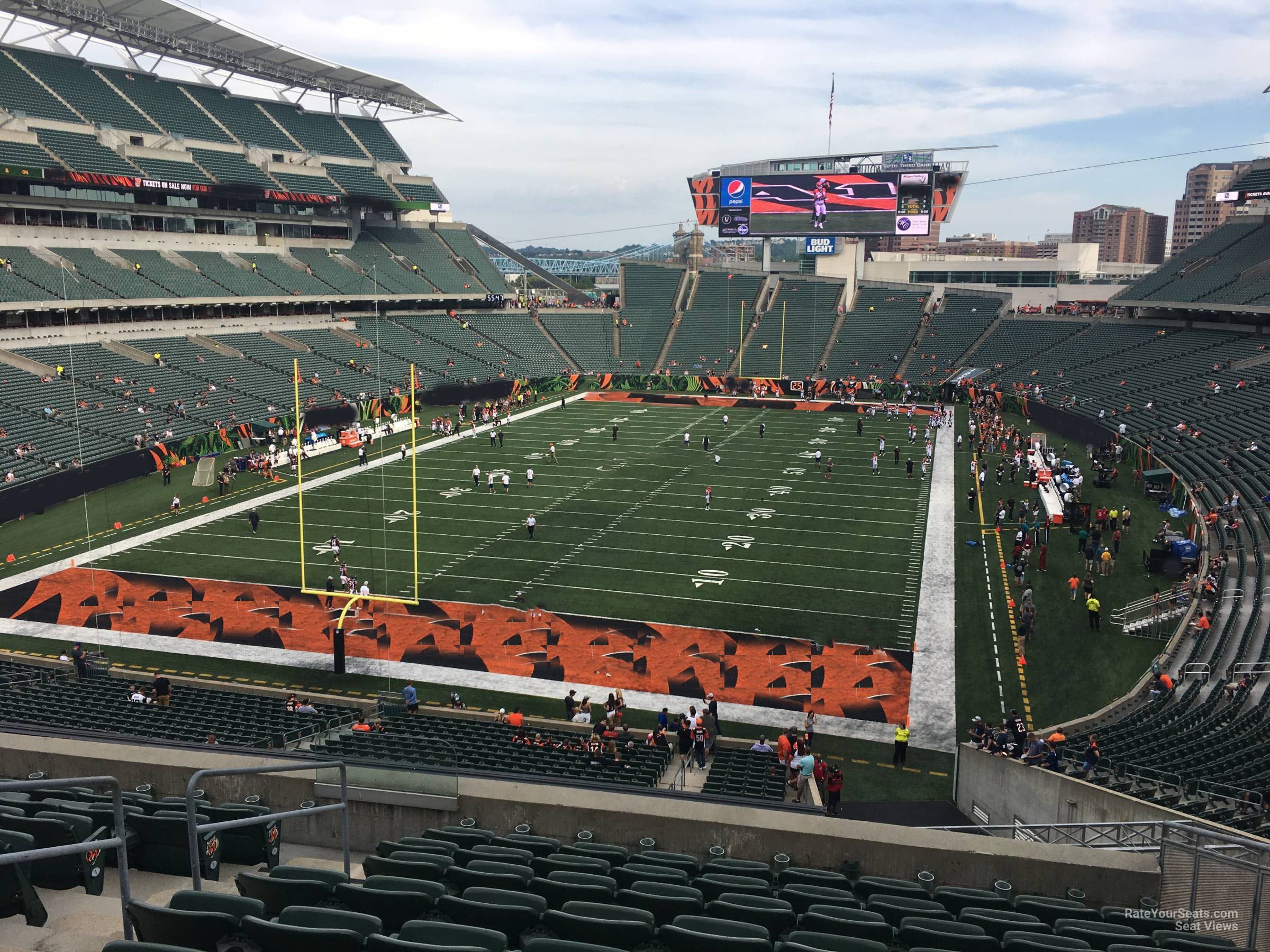 -The intricacies of Paycor Stadium continue in the second deck of the northwest endzone where Sections 222-230 form their own seating location. These seats are known for their classic views of the Ohio River. Besides for head-on views of opposite videoscreen and the river, the top rows in these section offer little else to ticketholders and should be completely avoided. Sitting above row 20 will guarantee you a long walk up the stairs and you may even be greeted with a heavy dose of wind. If you like elevated endzone seating, spend the extra money to be in the first 10 rows of these sections. The videogame-like views are unobstructed and the wind is much less severe.