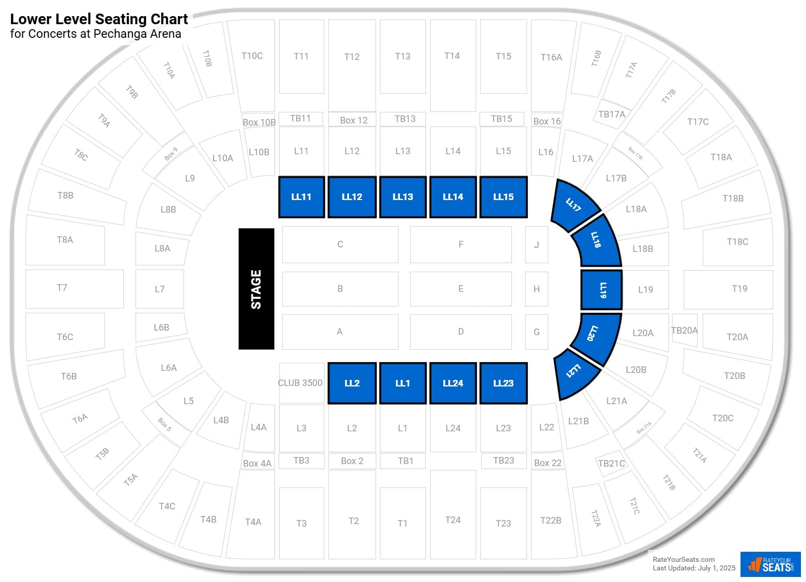 Lower Level sections at Pechanga Arena are the closest seats to the floor. These sections are commonly labeled "LL" on the seating chart.