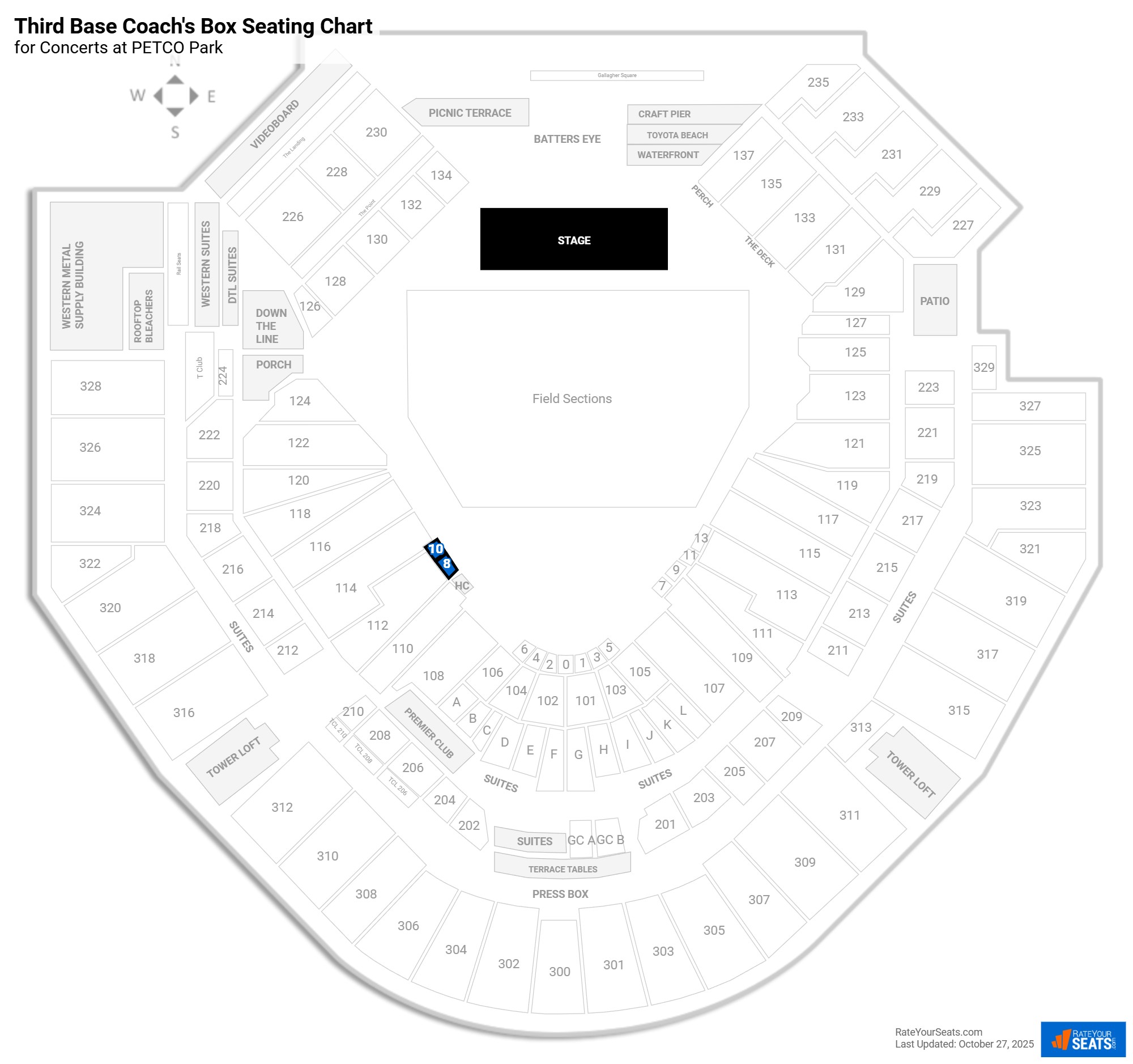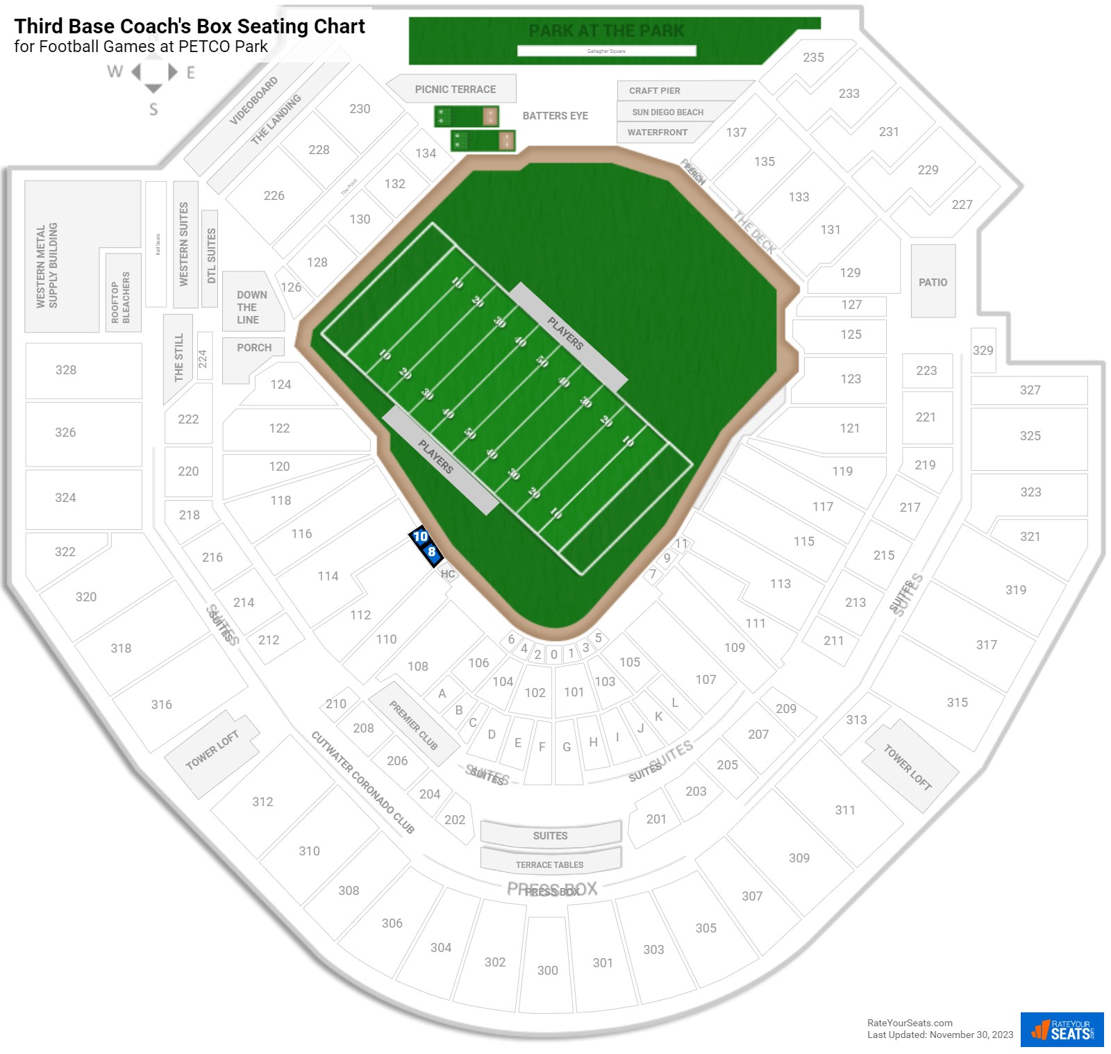 The Third Base Coach's Box at Petco Park offers an opportunity to take in a game in ways that many other baseball stadiums don't have. On the Padres seating chart these seats are located in sections 8 and 10.