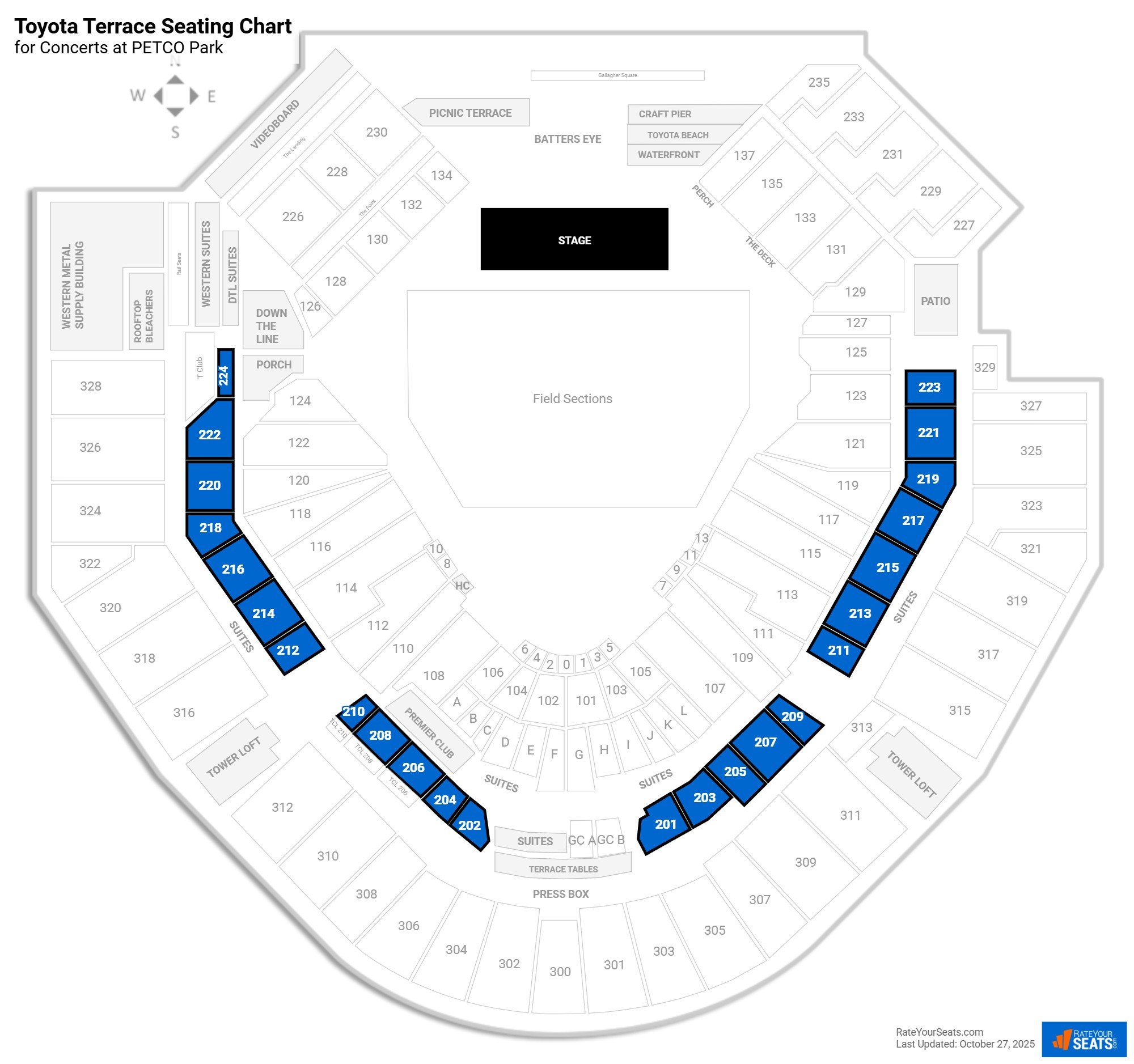 The Toyota Terrace Level is a popular seating option at Petco Park located on the 200 level. This is a good location for fans looking for good views and extra comfort.
