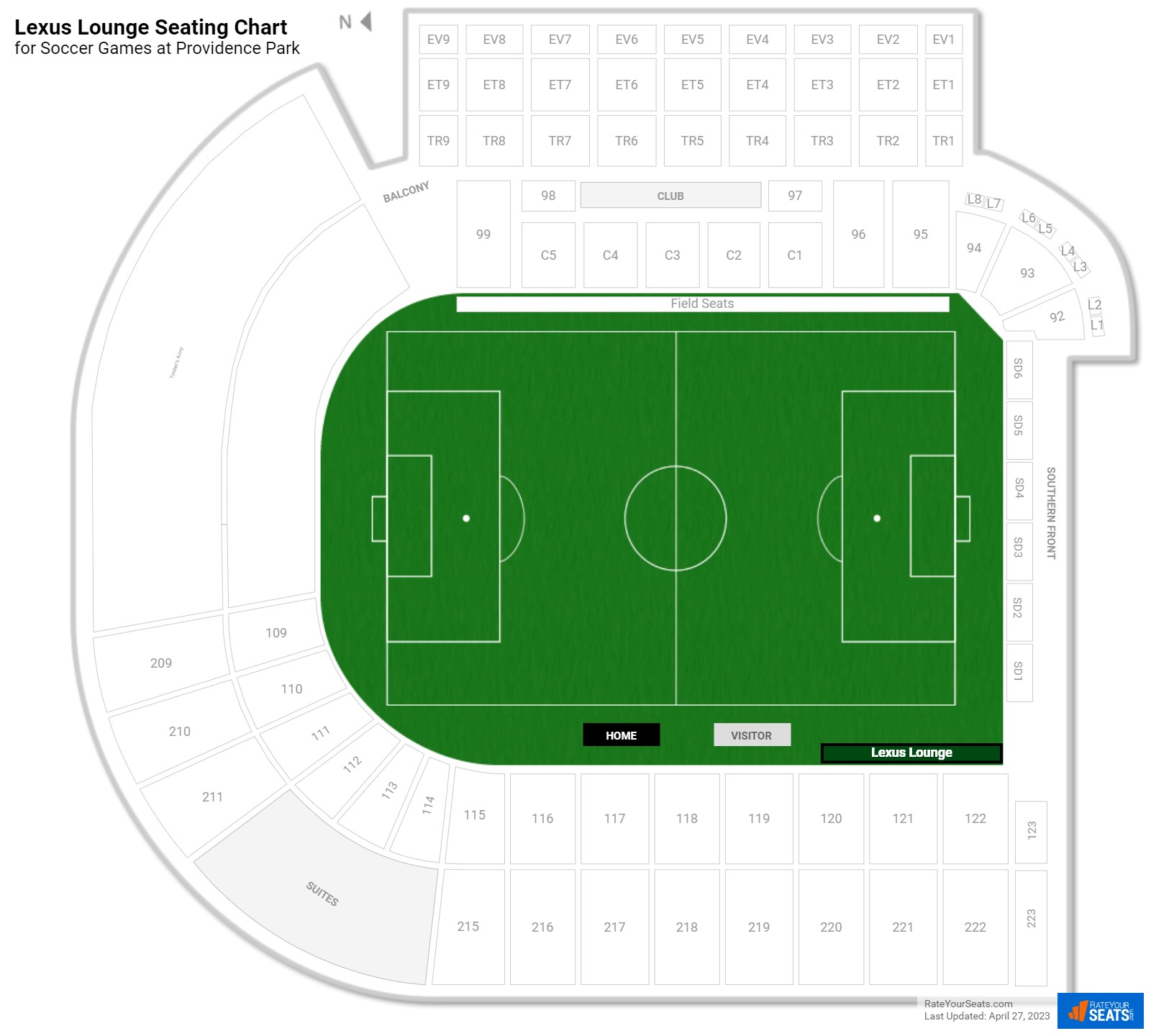This unique seating area is located adjacent to the visiting team bench in front of sections 120-122. Seats located closer to midfield are usually labeled Lexus Lounge Premier, but do not come with any additional benefits.