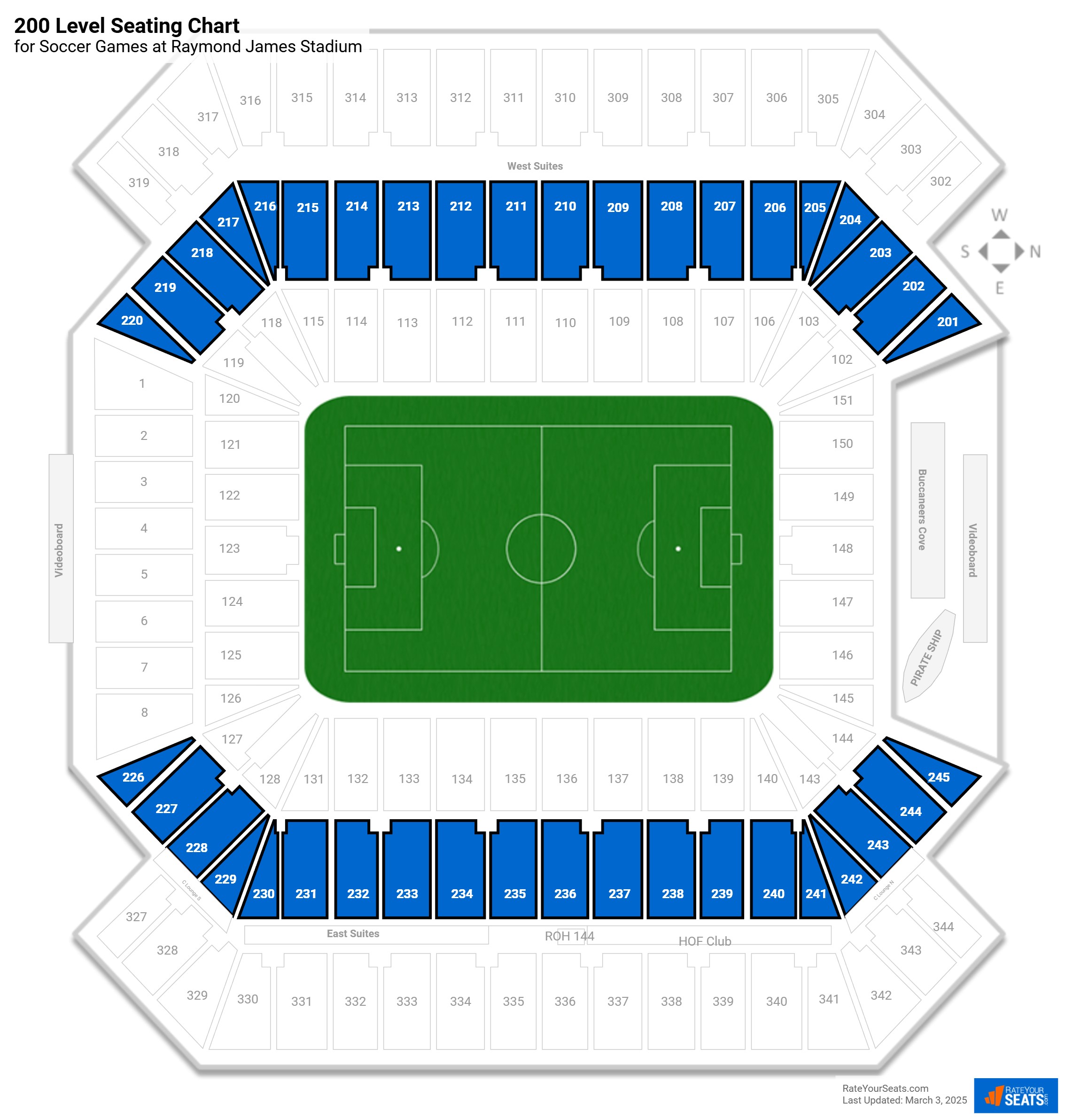 The 200 Level at Raymond James Stadium is split up into sideline and corner seating. Sections along the side are part of the Stadium Club and have access to an indoor area and upscale seating.