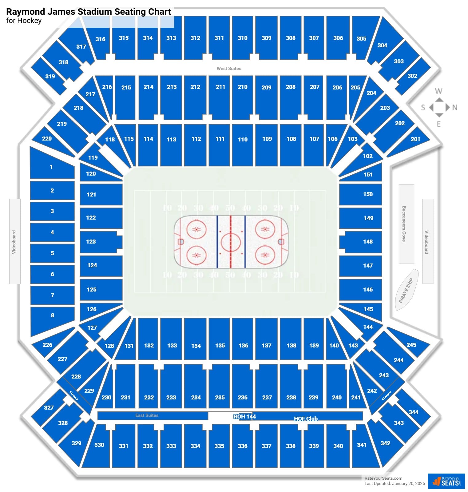 Raymond James Stadium hosts a number of different events, including South Florida Football games, soccer matches, concerts, baseball games and hockey games. These events each have a different seating chart. Select one of the maps to explore an interactive seating chart of Raymond James Stadium.