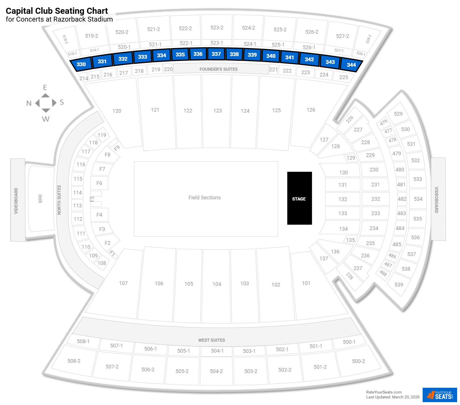 Located on the east side of Razorback Stadium, the Capital Club, also known as the East Indoor Club, consists of 15 numbered sections and spans the entire length of the field.