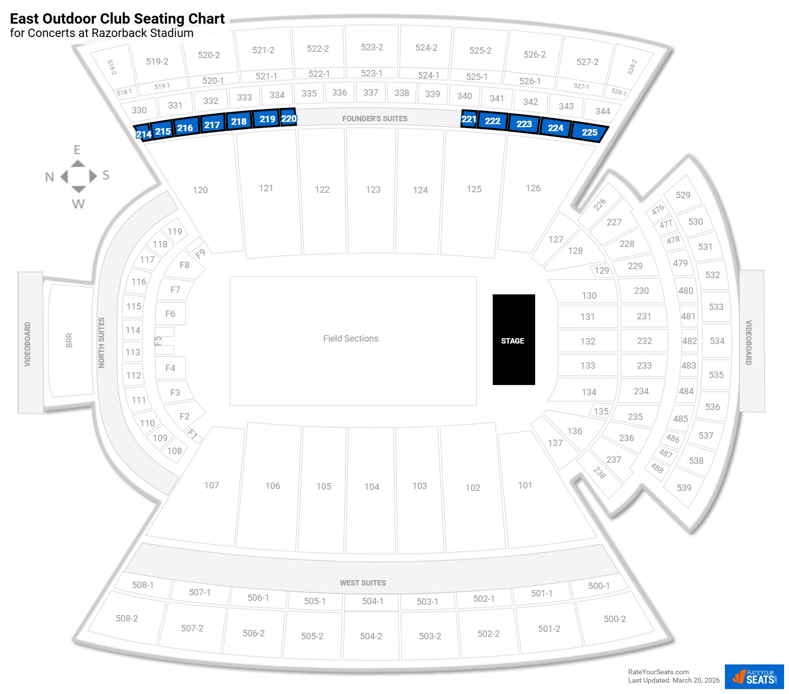 The East Outdoor Club is located on the east side of Razorback Stadium. The club is made up of 12 sections, with the Founder's Suites dividing the sections.