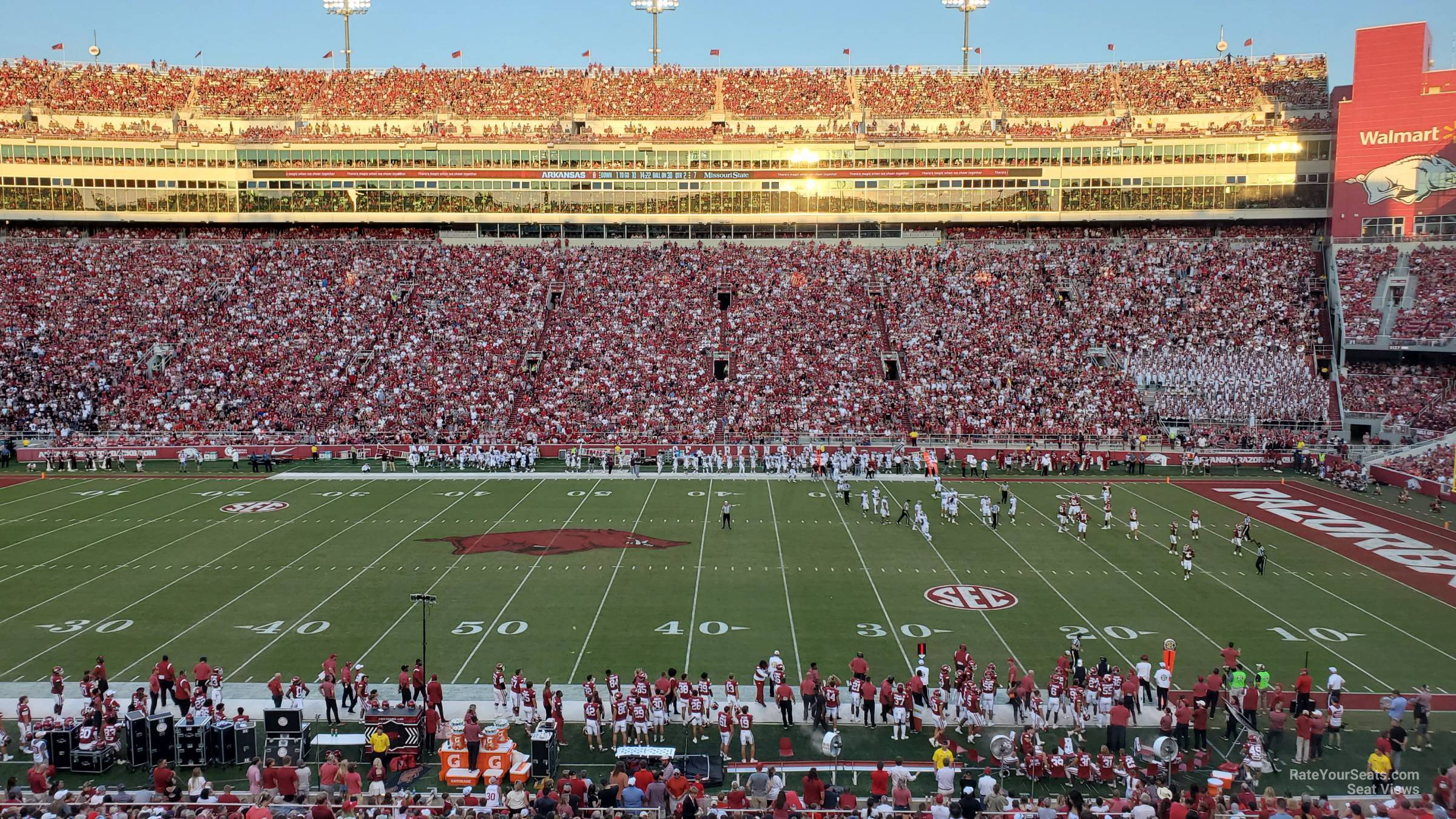 -The 100 Level Sideline sections at Razorback Stadium are located on the east and west side and are the largest sections in the stadium. Each section has no less than 58 rows and all seating is bleacher-style. For each section entrance tunnels are located in rows 10 and 39, so fans who struggle walking a lot of stairs should look for seats near those rows. Sections 103-105 and 122-124 are recommended for their great midfield view. The Sideline Upper Deck sections at Razorback Stadium are located on the east and west side of the stadium as well. On the east side of the stadium in the upper 500 level is where you will find student and visitor seating. Sections 525-2 through 528-2 are reserved for Arkansas students, while sections 518-2 through 521-2 are reserved for the visiting team's fans. For the best midfield views we recommend sitting in sections 533-2 through 524-2 on the east side of the stadium and sections 503-2 through 505-2 on the west side of the stadium.