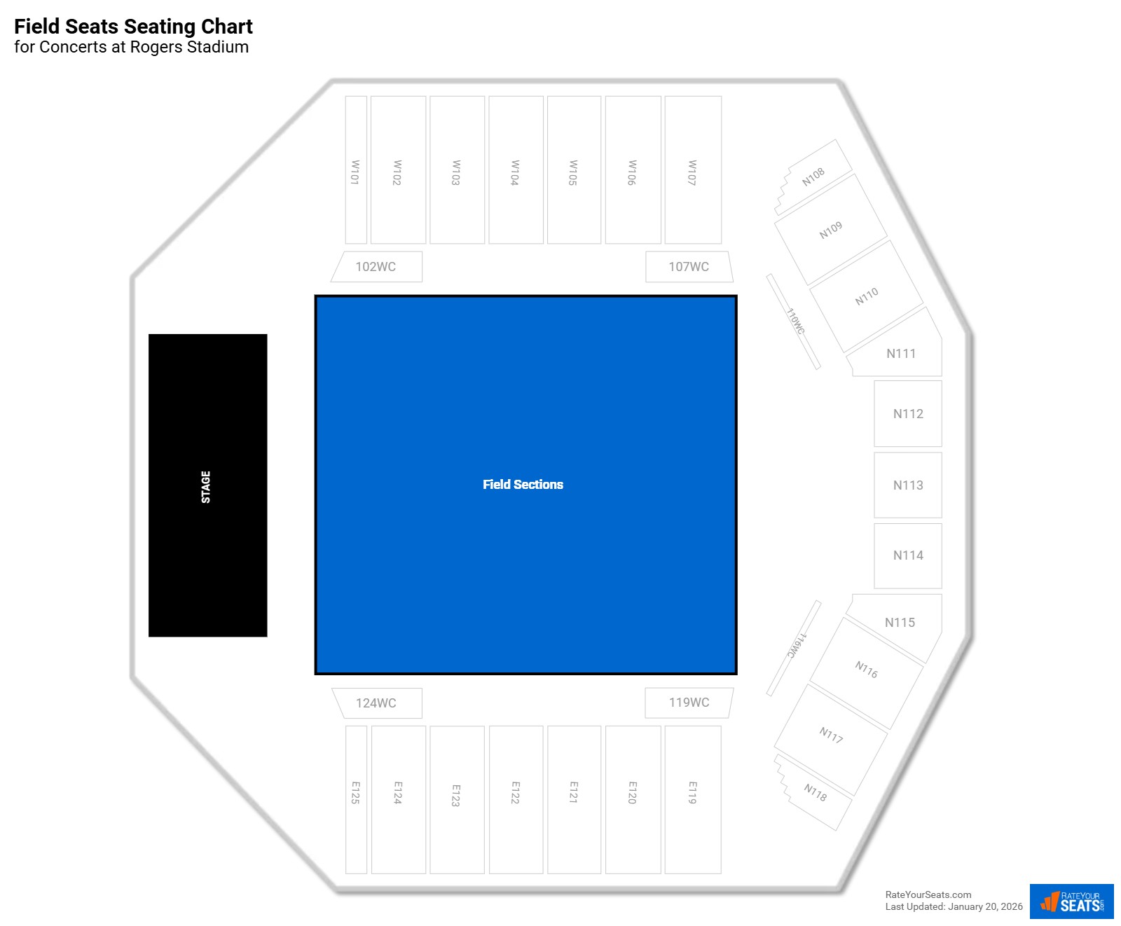 Field seats provide the most direct views of the stage at Rogers Stadium, particularly in the pit and front field sections. Fans seated farther back on the field still enjoy a strong overall view, though sightlines can be influenced by the flat surface and standing fans ahead.