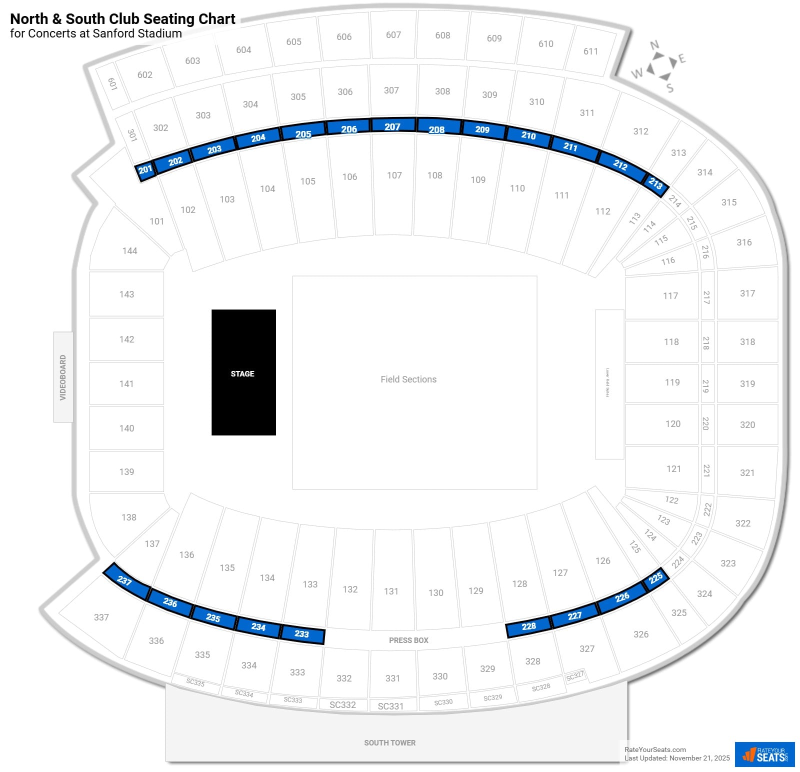For the best views at Sanford Stadium, consider sideline seating in the North & South Club. The perched position of these seats gives them impressive views of the entire field without being too far away.