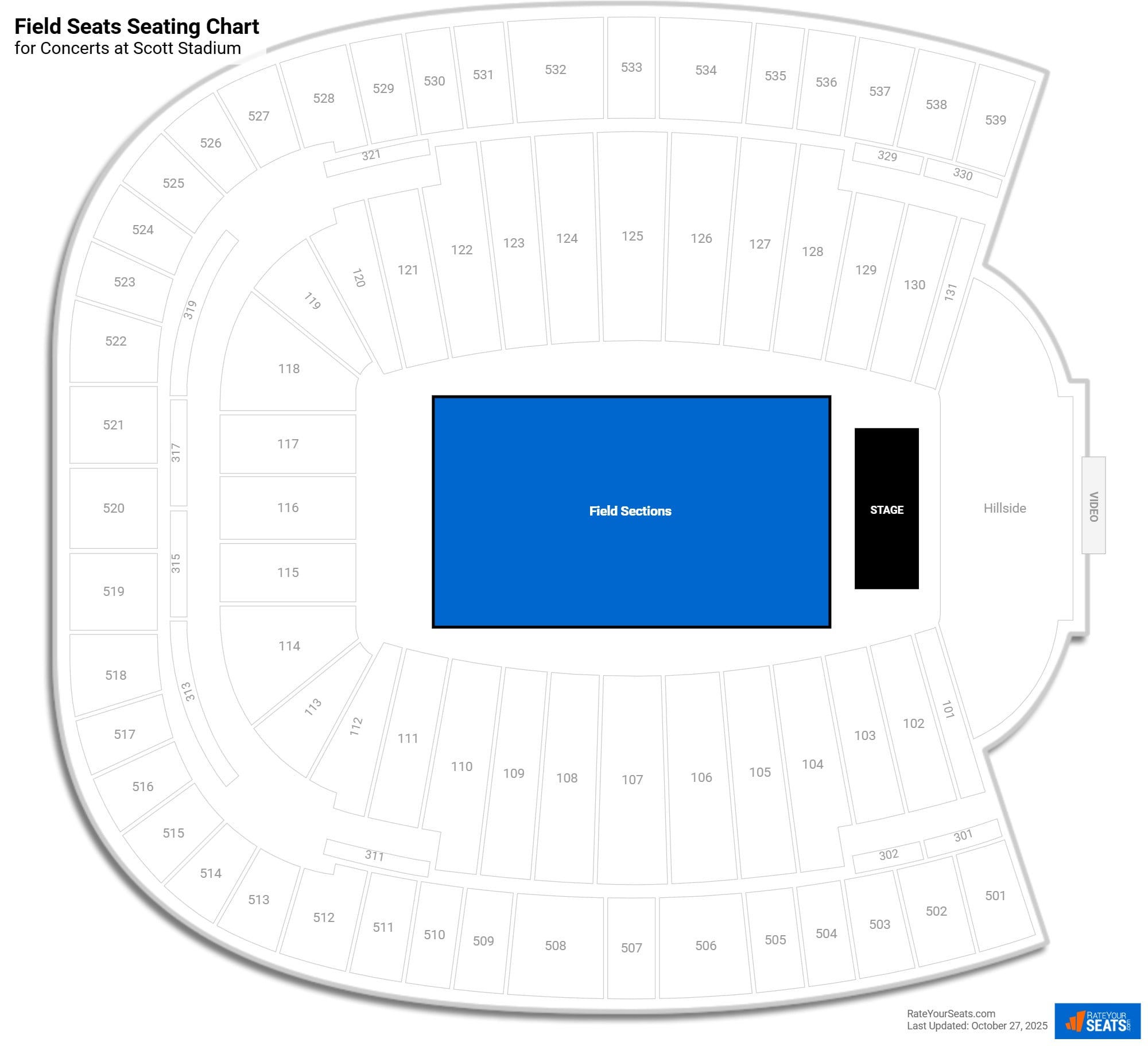 Field seats offer the most up-close concert experience available at Scott Stadium. Fans in these sections are positioned just a short distance from the stage and can enjoy clear, unobstructed views of the performance.