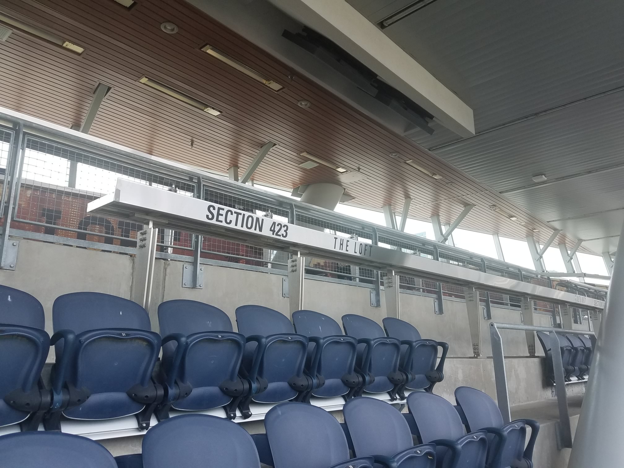 -Located just under the south endzone videoboard, the Loft sections at Soldier Field offer one of the more unique seating areas for a football game. Views of the field are distant, but fans will get a nice head-on perspective of the game and to the north endzone videoboard. Loft sections feature thre rows of chairback seating, followed by a standing rail at the top. Just above the standing room rail, fans will have a private bar and concession area, which also has heaters and televisions. So while better views can be found elsewhere, these seats are a great spot for socializing and also have some coverage provided by the videoboard just above.