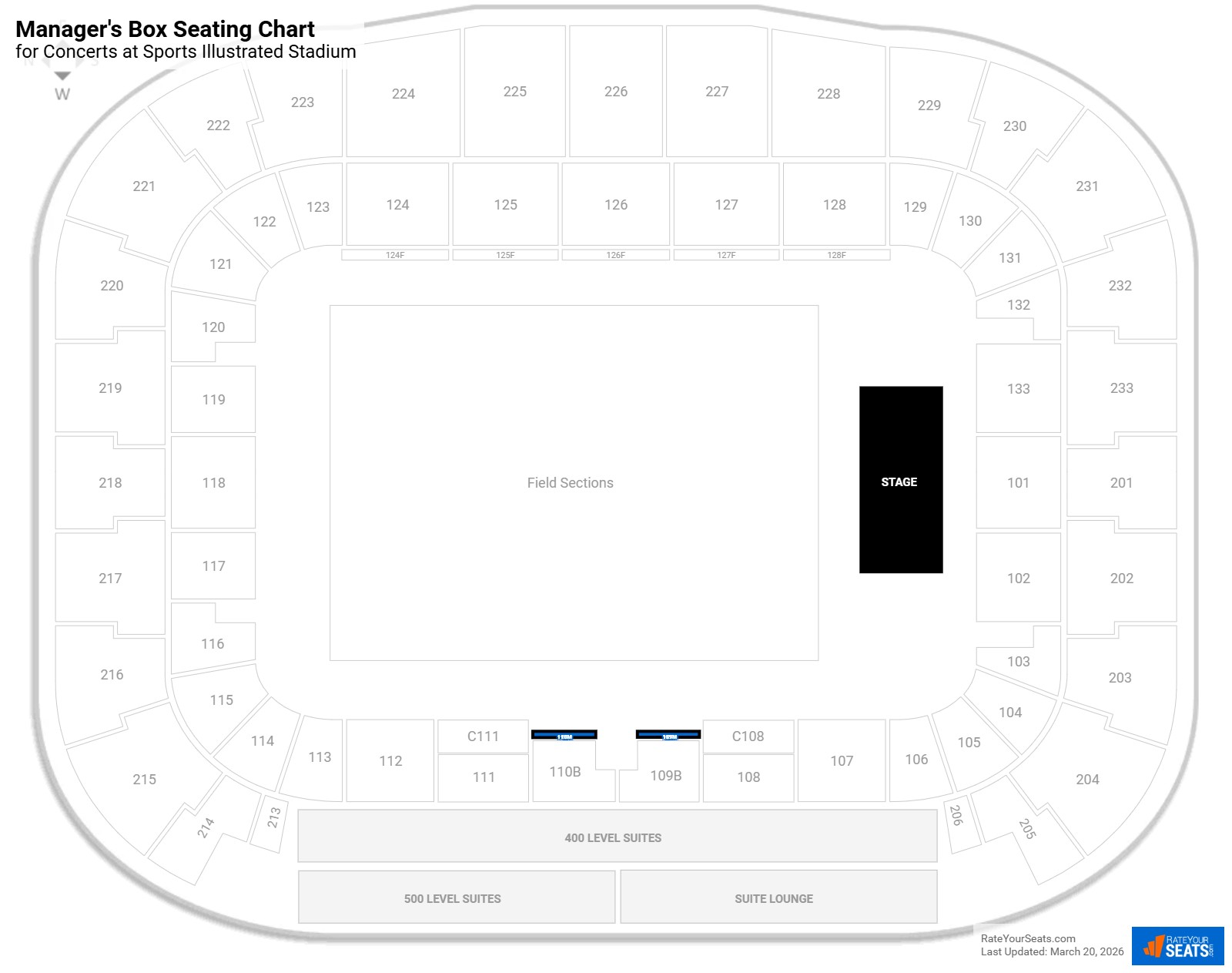 Manager’s Box Seats are located in the first row of Sections 109 and 110 along the sideline.