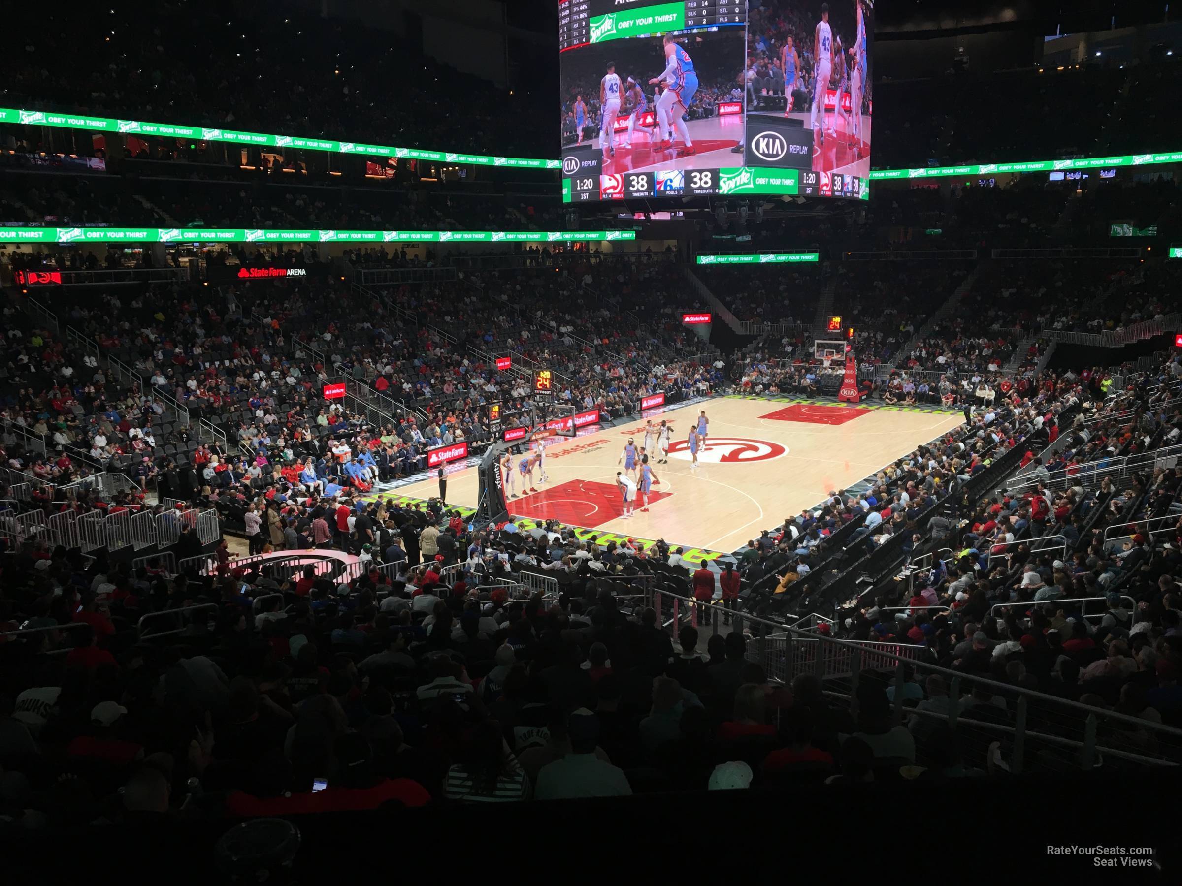 -Corner sections are an inexpensive way to experience Hawks basketball from the lower level. If you're attracted to the ticket price in these seats, carefully consider the section you want to sit in. While tickets in sections 101, 106, 110 and 117 seem like good deals (relative to sideline seating), the first ten rows in these sections should be strongly re-considered. For the best views, avoid double-letter rows and rows A-F. These lower rows have terrible angles towards mid-court and will force you to turn your neck all night to see the action on the court. As an alternative, choose one of the higher rows in these sections or choose a different section altogether. The remaining corner sections are further away, but also have a slightly better angle toward the action on the court. The biggest options to weigh when sitting in this location are proximity and comfort.