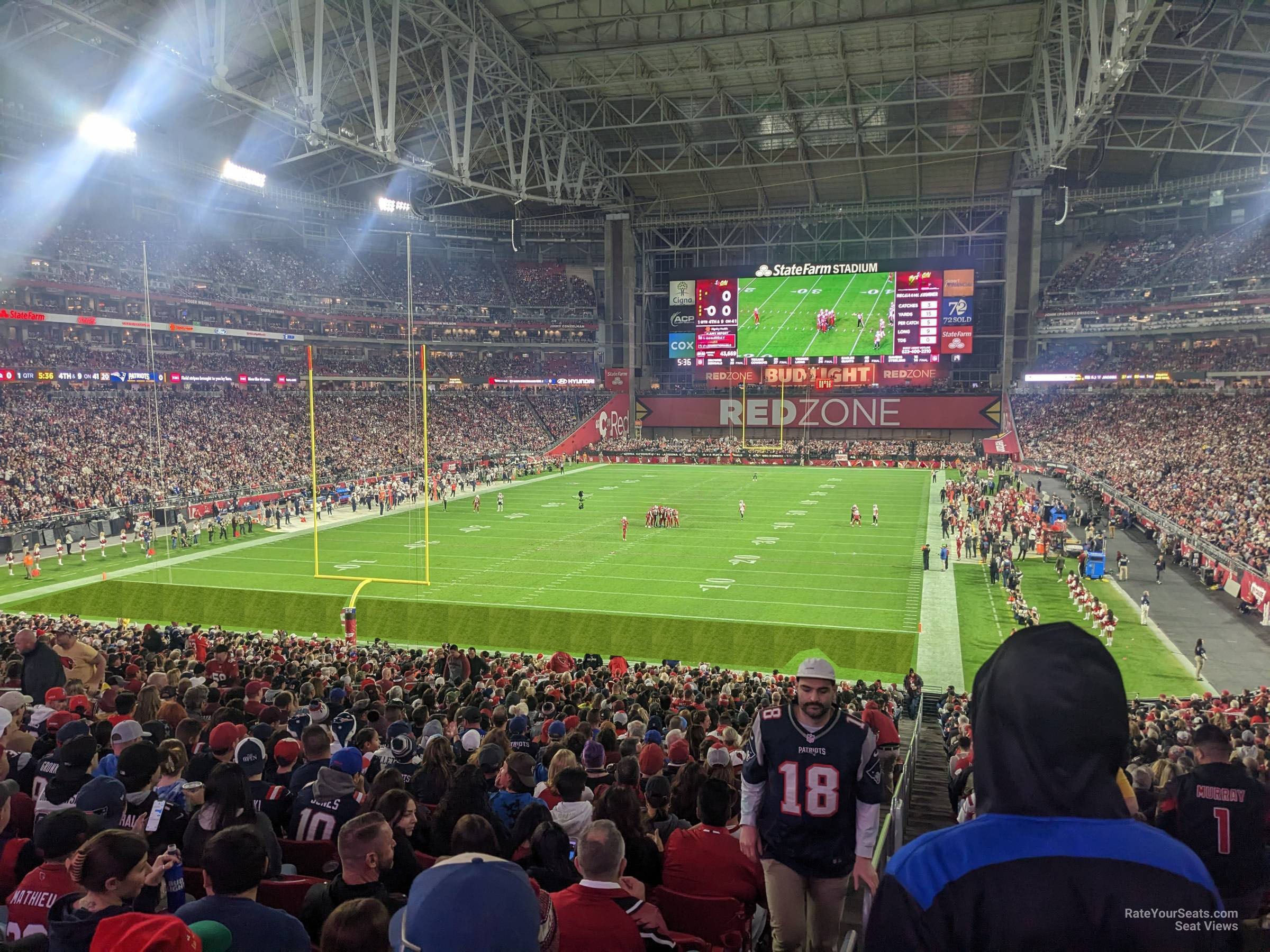 -The Main Level at State Farm Stadium includes all 100-level seats. There are 44 sections numbered 101-144. Sitting in the 100-Level Main-level seats are known for bringing fans close to the action on the field. Most sections have around 41 rows of seats. Caution: When sitting in rows 14 and below, players and equipment can block your areas of the field from view. For this reason, we recommend rows between 15-30 for the ideal viewing height. Red Zone Seats (138-144) One group of seating that is unique is the Red Zone in sections 138-144. These seats have a large patio behind them to enjoy during intermissions or pregame. Sections near the end zones can provide a ton of excitement for scoring plays but can be more difficult to see the details at the other end of the field. Main Level Concert Seating For concerts, the stage is typically set up on the side of the field nearest sections 101 and 137. To get the best views from the level, we recommend seats in the low rows of sections 106-110 and 128-132.