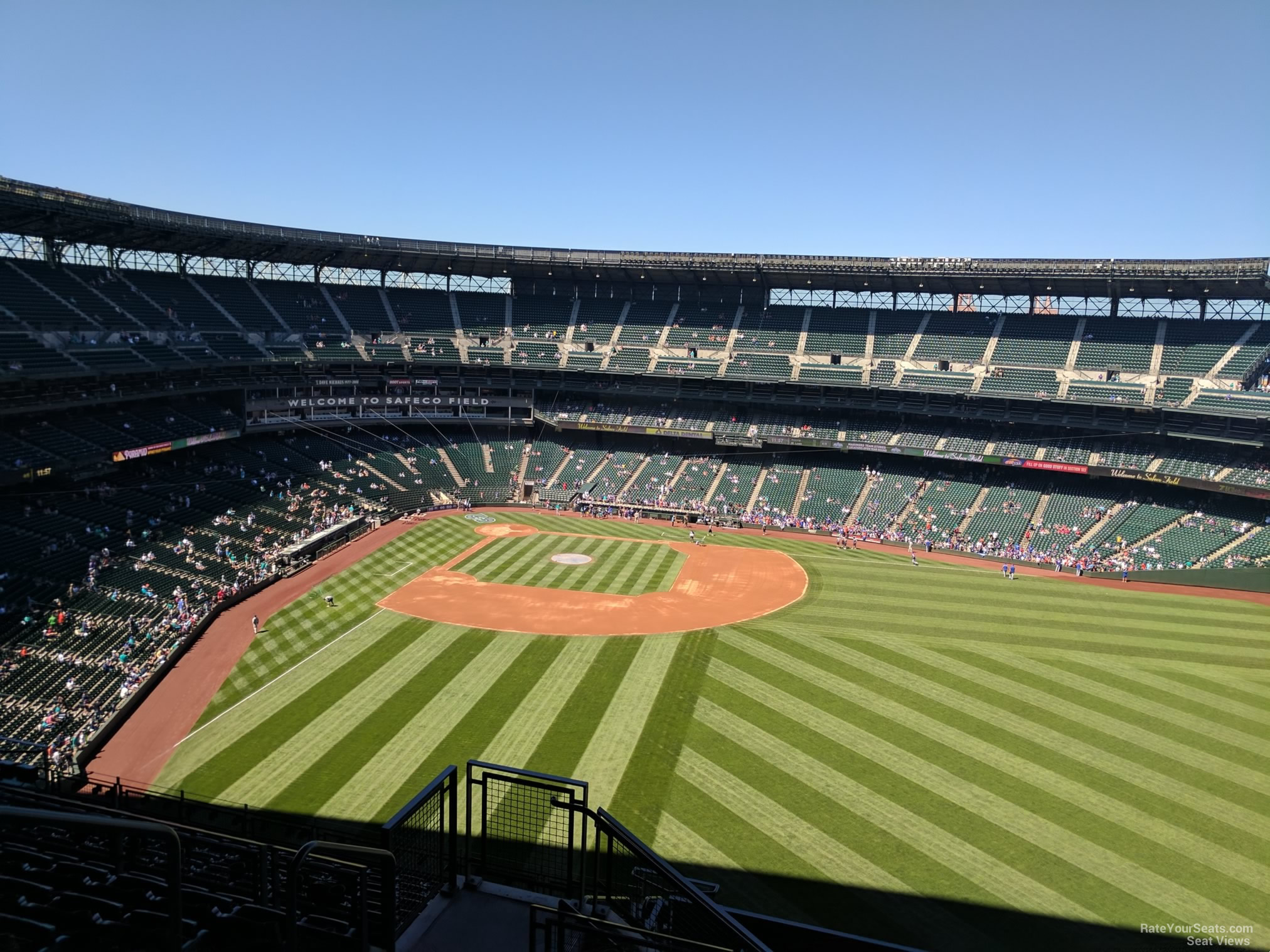 -On the T-Mobile Park seating chart, the View Level is made up of sections 306-347. These are typically the cheapest tickets for a Mariners game, but guests can also find some outstanding views of the game and the surrounding area. View Level sections have 25 rows of seats with an entrance at row 5. We're a big fan of rows 1-4 where you'll get the best views and be just below the section entrance. Infield Sections Fans on a budget will enjoy infield seating in the upper deck at T-Mobile Park. Sections 328-333 will give you a home plate view of the field, a head-on view of the center field scoreboard and a look to the left will show you the Seattle skyline. Sections Down the Line For baseball games, the farther you are from home plate, the worse your view will be. The opposite is true for concerts. Though incredibly far from home plate, Section 313 is near men's and women's restrooms, the Landing Bar and ice cream -- not to mention it offers a great view of the skyline. Though they are well protected from the sun, Rows 15 and above should be avoided if you have issues with steep stairs. Seats on the first-base side of the field will have the best view of the skyline. Outfield Sections View Level seats in the Outfield are made up of sections 306-310. These seats are well-protected by the retractable roof (even when it's open), but incredibly far away from home plate. Great for grabbing a beer and casually watching baseball, but not great for seeing detail or the scoreboard.