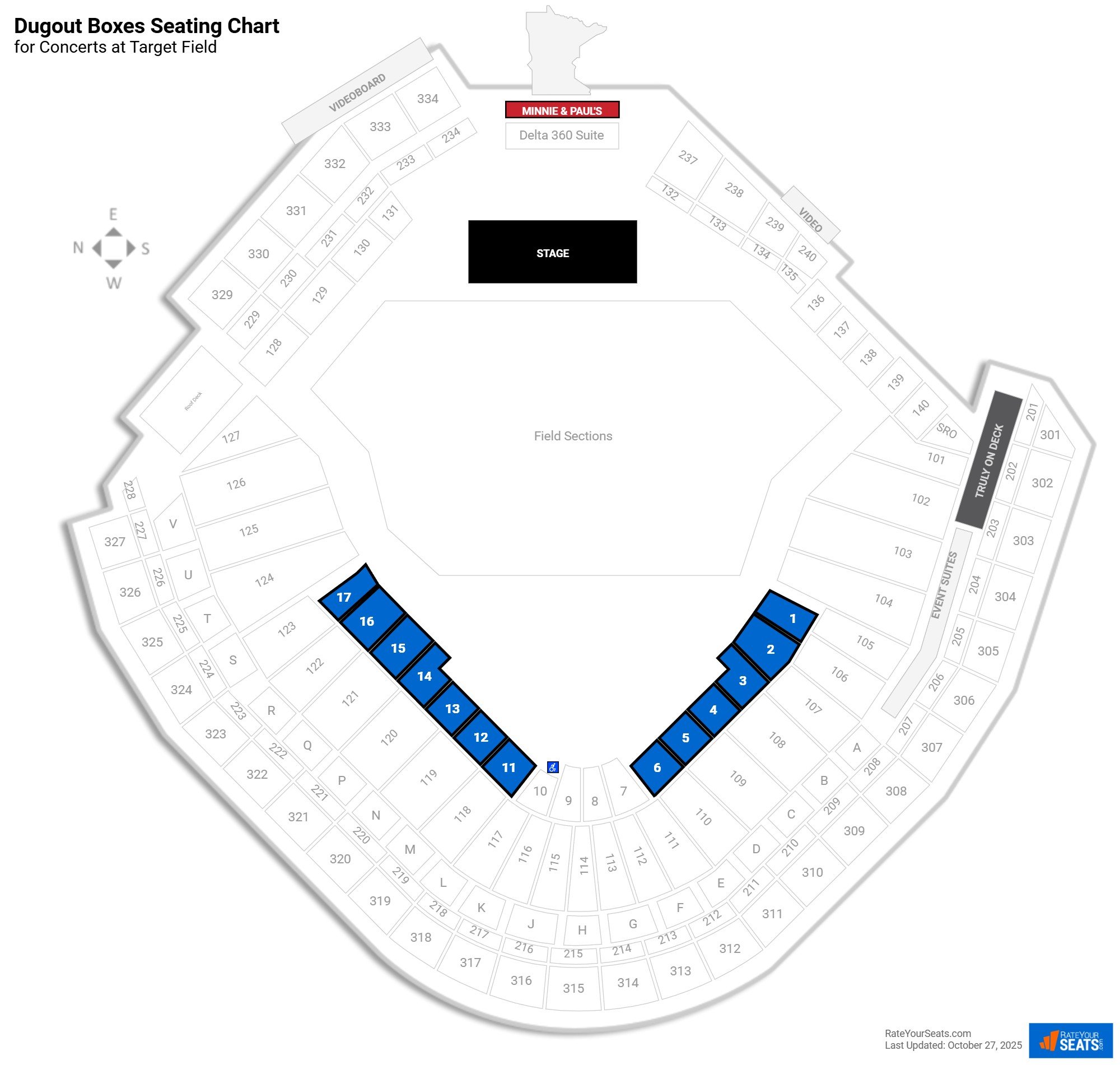 Infield seats located at field level are also known as Dugout Boxes for Twins games. These seats offer access to the first base (1B) Lounge located near Section 1, and the third base (3B) Lounge near Section 17. Owing to their exclusivity, these lounges often have shorter lines for restrooms and concessions