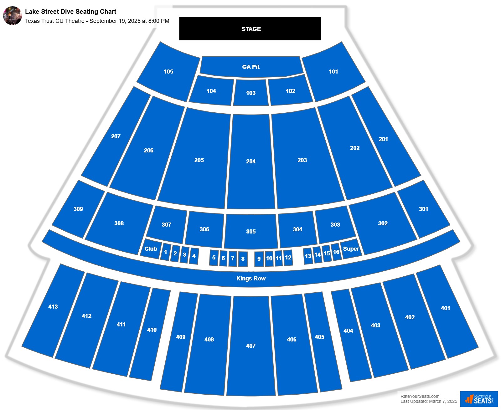 Texas Trust CU Theatre concert seating charts vary by performance. This chart represents the most common setup for concerts at Texas Trust CU Theatre, but some sections may be removed or altered for individual shows. Check out the seating chart for your show for the most accurate layout.
