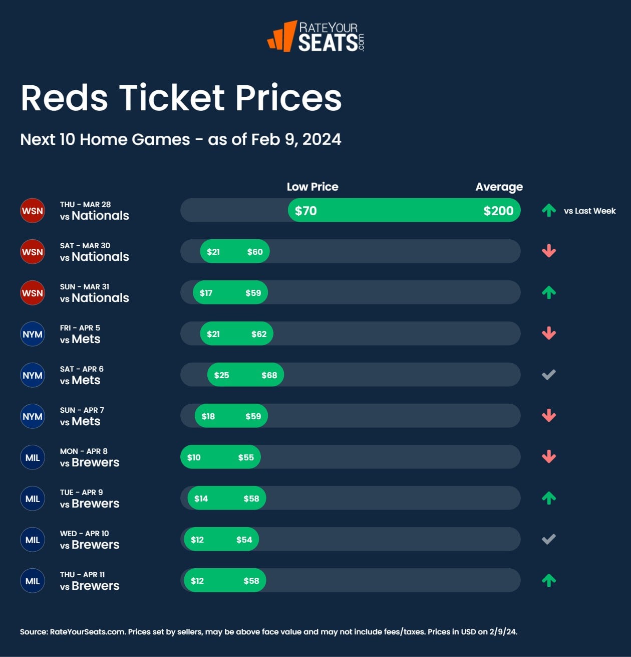 Reds ticket prices can vary depending on where in the stadium you are looking to sit. Ticket prices are always changing due to a variety of factors like the team's performance, day of the week, and opponent.