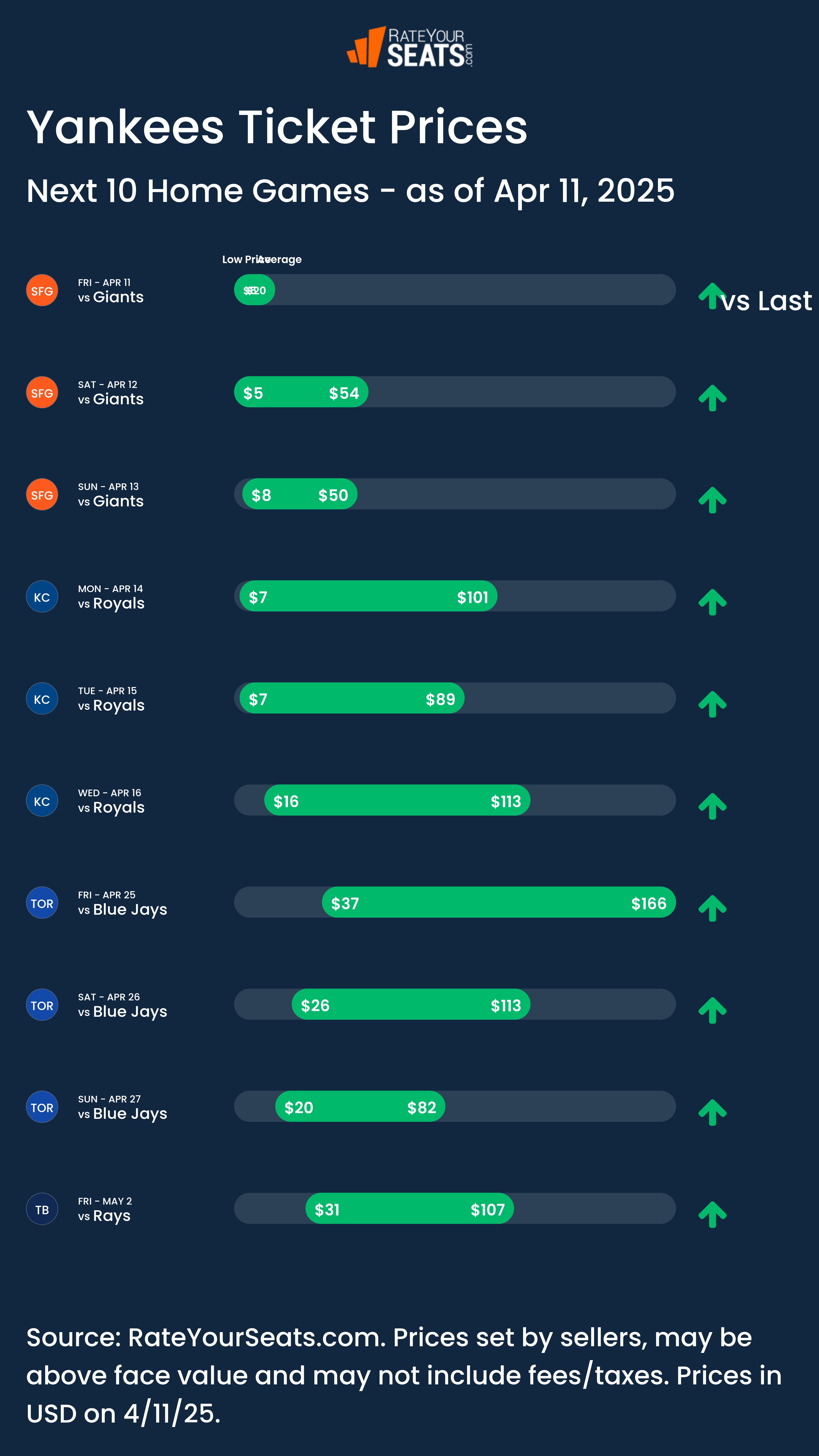 Yankees ticket prices can vary depending on where in the stadium you are looking to sit. Ticket prices are always changing due to a variety of factors like the team's performance, day of the week, and opponent.