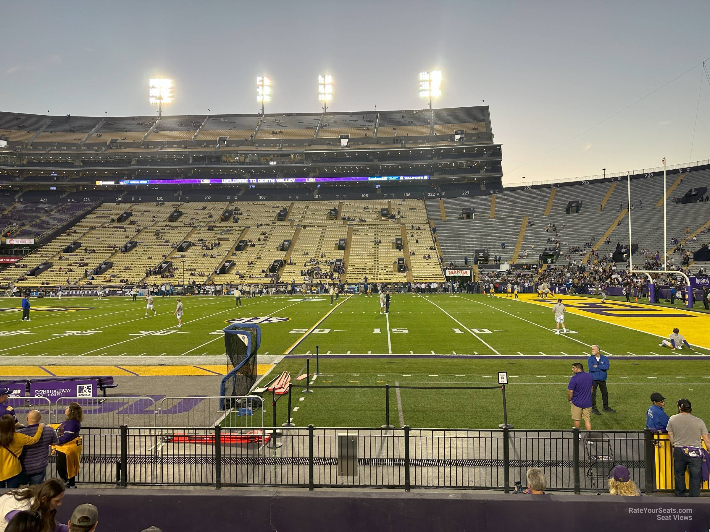 -As the only area to find midfield views while staying on the lower seating tier, the Lower Level Sideline seating location is home to some of the best views of an LSU Football game at Tiger Stadium. Fans will have excellent views of both ends of the field, and for the best seating height to see over the player sidelines, we recommend opting for seats in Rows 20-30. Sections here are among the largest in the stadium with 65 numbered rows of seating, however as there are entry tunnels located at Rows 12, 26, and 47, you'll never be left with a monster 50 row walk to and from the concourse. Seating consists of backed bleachers, so while you won't have an individual chair back seat, there is still some back support available. Seats on the west sideline (behind the LSU bench) will have the sun at the back sooner, while fans on the east sideline will have the sun at your face for the majority of a day game.