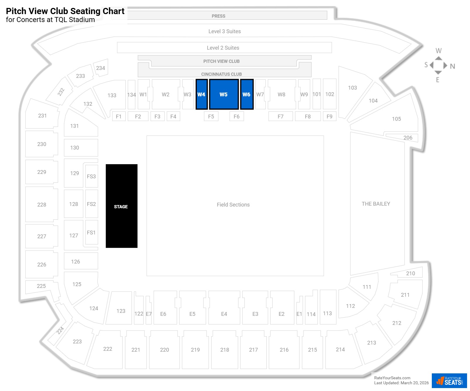 Sections W4–W6 are located along the West sideline at midfield. These sections sit within the broader Cincinnatus Club seating range but represent a more exclusive tier.