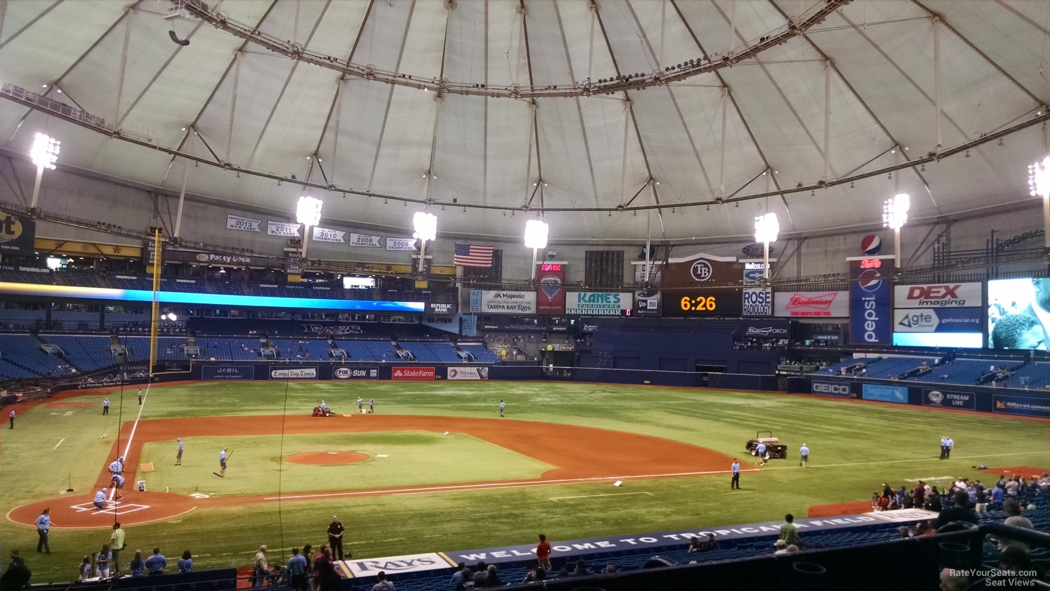 -While the Home Plate Club seats receive much of the fanfare at a Rays game, the Baldwin (formerly) Rays Club seats offer many of the same amenities from a slightly different perspective. Located down the first baseline - just above 100 level seats - are club sections 106-126. Ticketholders will be seated on padded, leather chairs for one of the stadium's most comfortable experiences. Ticketholders also enjoy a complimentary buffet with featured entrees, ballpark food and bar drinks for an additional fee. These club seats also come with access to the club lounge with televisions, comfortable seating and dining areas.