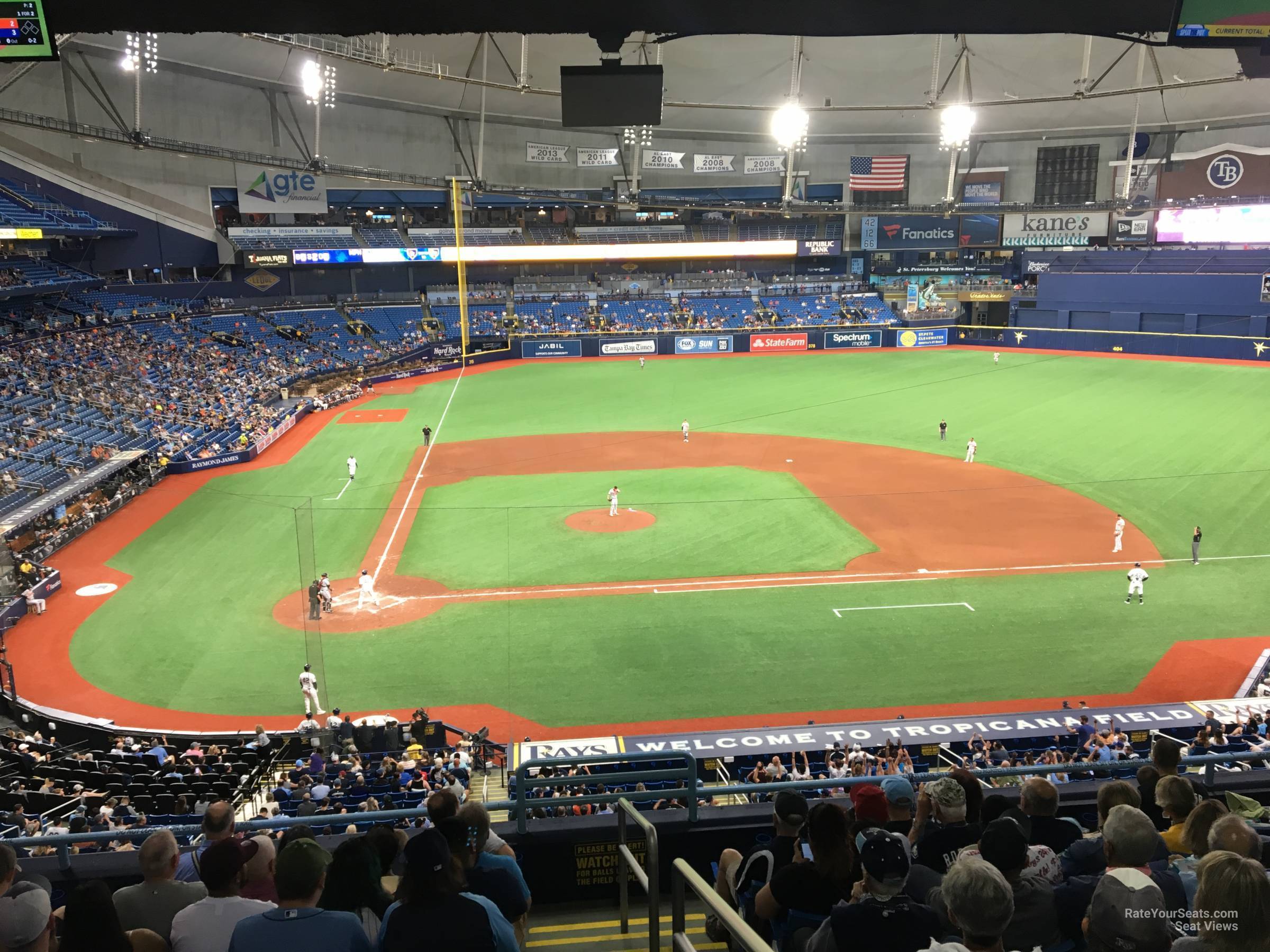 -Press Level seating at Tropicana Field is made up of sections on the 200 level. These seats are a great option for guests who enjoy a slightly elevated view of the field. Even-numbered sections are on the first baseline (the Rays side), while odd-numbered sections are on the third base side. Most Press Level sections are the similar with just seven rows of seats and the first row labeled A. In many newer ballparks, the second level of seating is club seating. That's not the case at Tropicana Field where Press Level ticketholders do not receive any special benefits. Despite the lack of amenities, the view from these sections is mostly good. Whether you're attending a Rays game or the occasional college football bowl matchup, you can expect to see the entire field clearly. For baseball games, try to avoid the Press Level sections farthest away from home plate. These seats are poorly angled and will force you to turn your body to see home plate.