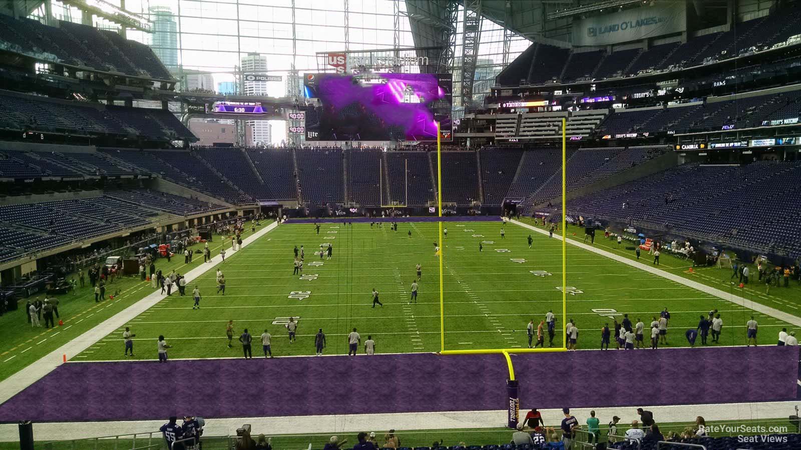 -For a comfortable view from the lower level, these endzone sections are a great option without having to spend a bit more for a premium club ticket at a Vikings game. Fans will have straight away views of the action on the field, and will also have little head turning to do when catching a replay on the videoboard at the far end of the stadium. Both endzones feature similar structures with as many as 42 numbered rows in each section, and as many as 27 seats in each row. Entry tunnels are located at the top of the sections for the majority of the seats here, so while you’ll get closer to the action and find fewer seats per row in the lower numbers, you’ll also have some of the longest walks possible to the restrooms and concessions. Choosing which endzone is best however will depend on your preferences as a fan. The east endzone (sections 118-121) offers a better spot for overall views much in part to the excellent sight lines to the Minneapolis skyline in the background. In contrast, the west endzone will be the better pick for fans who aren’t always glued in to the action and prefer the mix of a social environment created by the large open concourse area just above the seats.