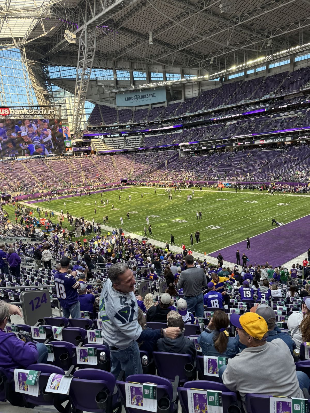 -Sitting in the corners of the lower level at US Bank Stadium gives fans a more affordable option for first tier views without being behind the back of the endzones, however these sections are also the largest of any in the stadium with as many as 60 seats in a row. Even with an additional aisle which runs down the middle of the sections for accessing rows 17 and higher, getting in and out of your seat here can be quite the challenge unless you find yourself near an aisle. Entry tunnels are located at the top of the sections, however as the higher rows are also where you’ll find the most number of seats, fans will want to choose their row and seat number carefully. A unique feature of the 100 level corner sections when compared to the neighboring sideline sections is the additional elevation between seating rows. Walks down to the lower rows will therefore be a bit steeper than the lower level sideline sections, but this also creates a better viewing height above field level and over the fans sitting in front. Corner sections at the west endzone (sections 101, 103, 136, and 138) are a better choice for fans who prefer a more social experience at a Vikings game due to the large open concourse just above the near endzone, while those who prefer an overall viewing experience area would be better suited for the corners near the east endzone thanks to viewing angles to the larger videoboard and Minneapolis skyline.