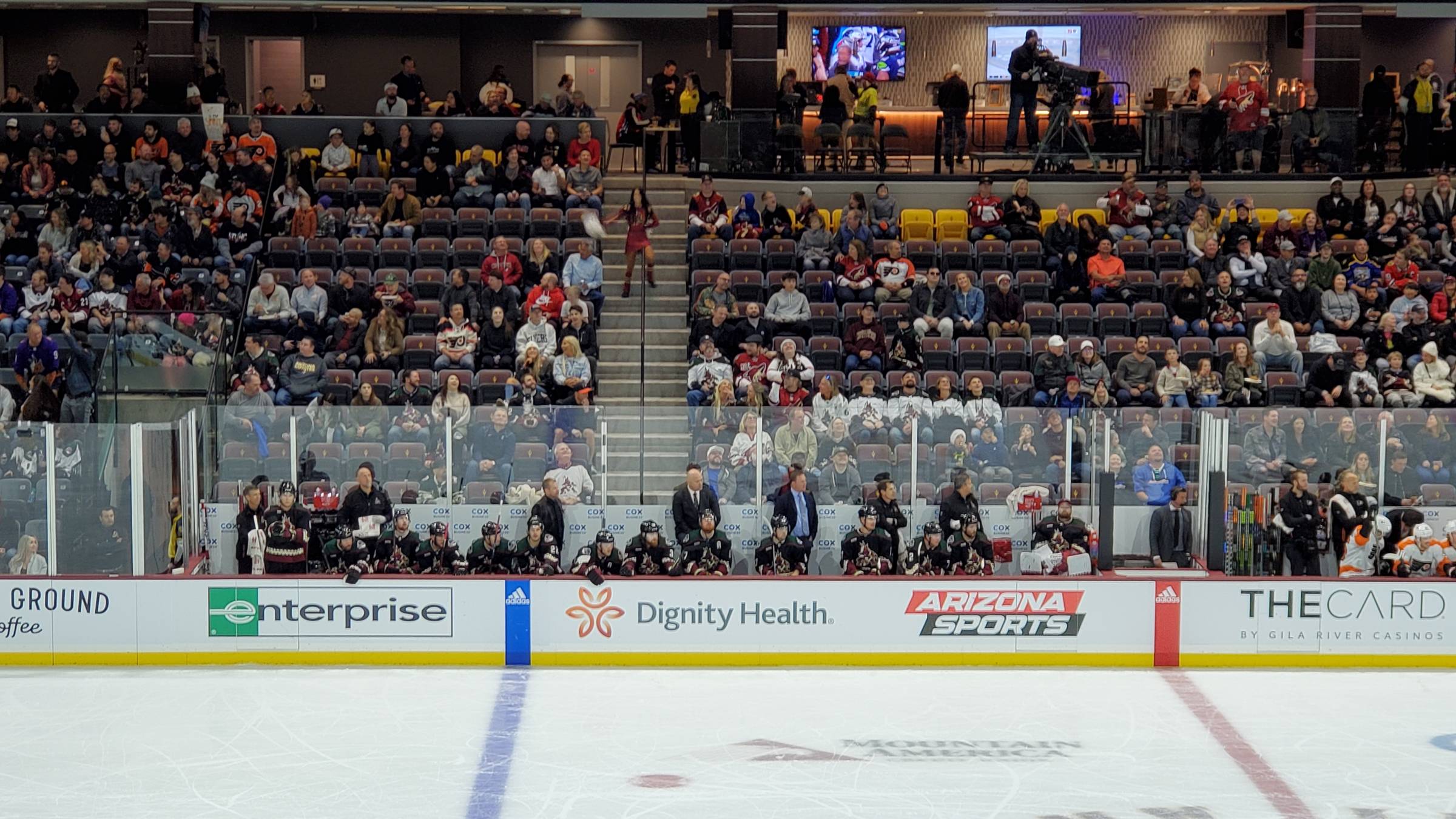 For Coyotes games, the visitors bench is located in front of sections 101 and 102 at Mullett Arena.