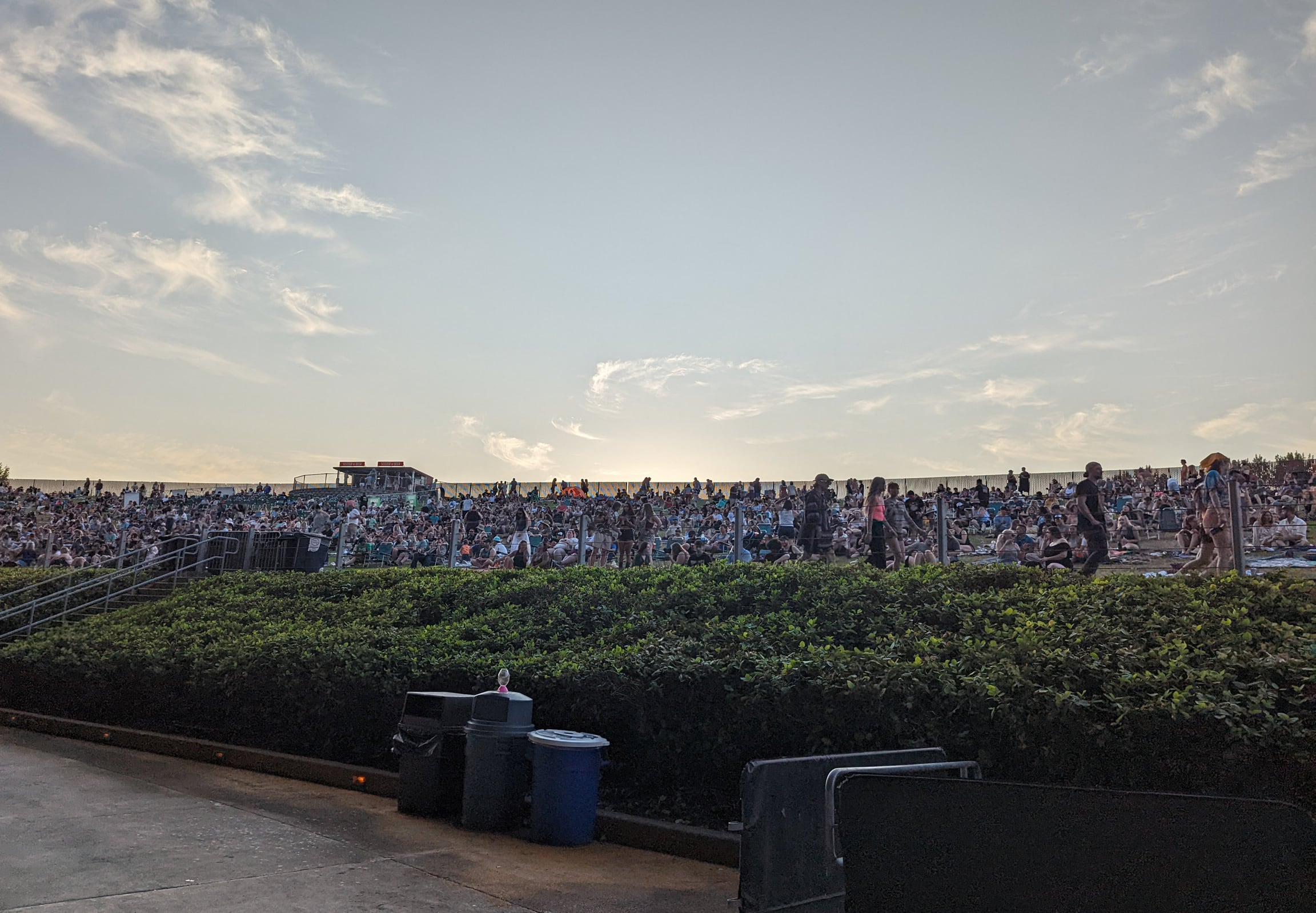 Views to the stage are first-come, first-serve. Support poles holding up the pavilion roof are minimally invasive so most areas of the lawn have clear sight lines to the stage.
