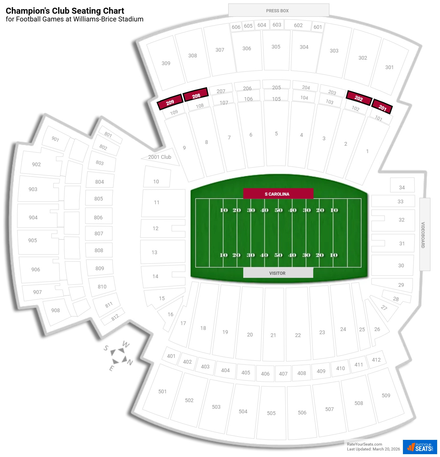 Located on the edge of the 200 level, the Champions Club at Williams-Brice Stadium offers outdoor covered seating in oversized cushioned seats with cupholders. Fans will also find outdoor large-screen monitors for catching up on replays.