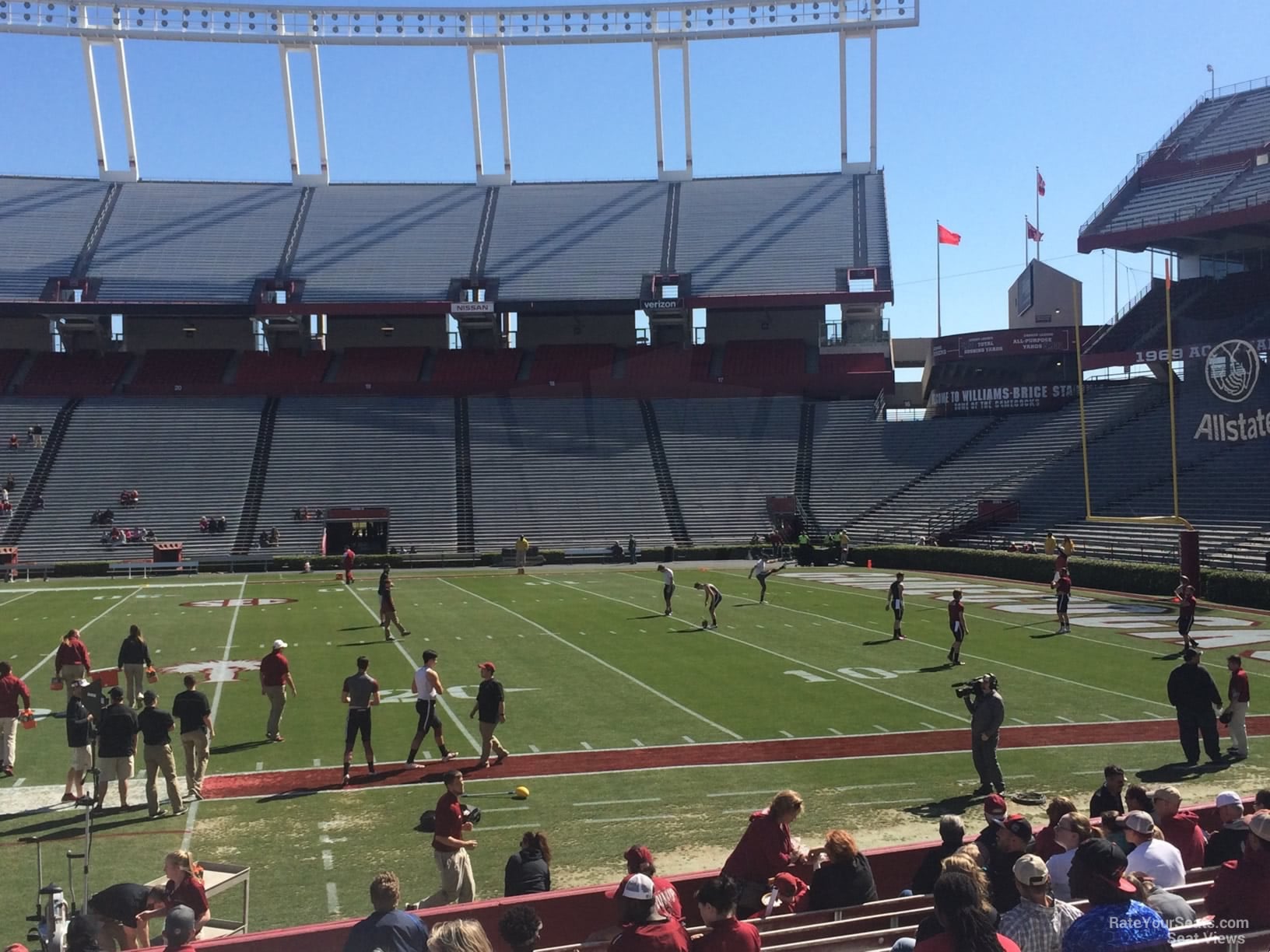 -The best seats in the lower level at Williams-Brice Stadium are found in sideline sections 1-9 and 17-25. In addition to being behind the player benches, these sections offer superb angles towards the field. Among these sections, Rows 25-40 on the west side of the stadium (the South Carolina side) offer the best experience. In addition to being at an ideal height to see all of the action, these rows are close to the entry tunnel at Row 20 so you can easily access the concourse. These seats also have the sun behind them and are the first lower level seats to get shaded by the press box. In this location, sections 23-25 are designated student sections. South Carolina is known to have a very passionate student section at their games, so it will most likely be very loud around that area. Each section in this location has 43-53 numbered rows.