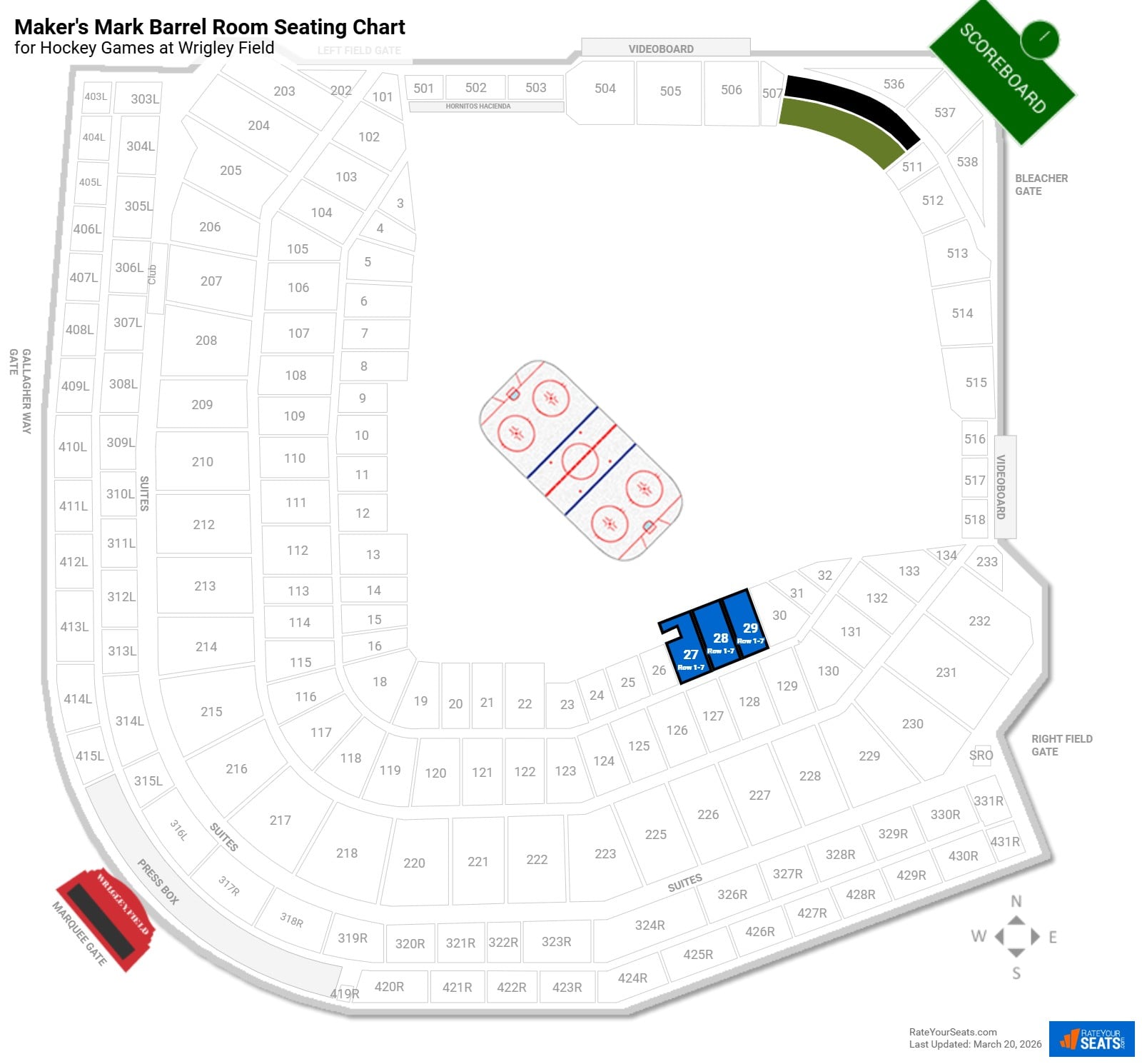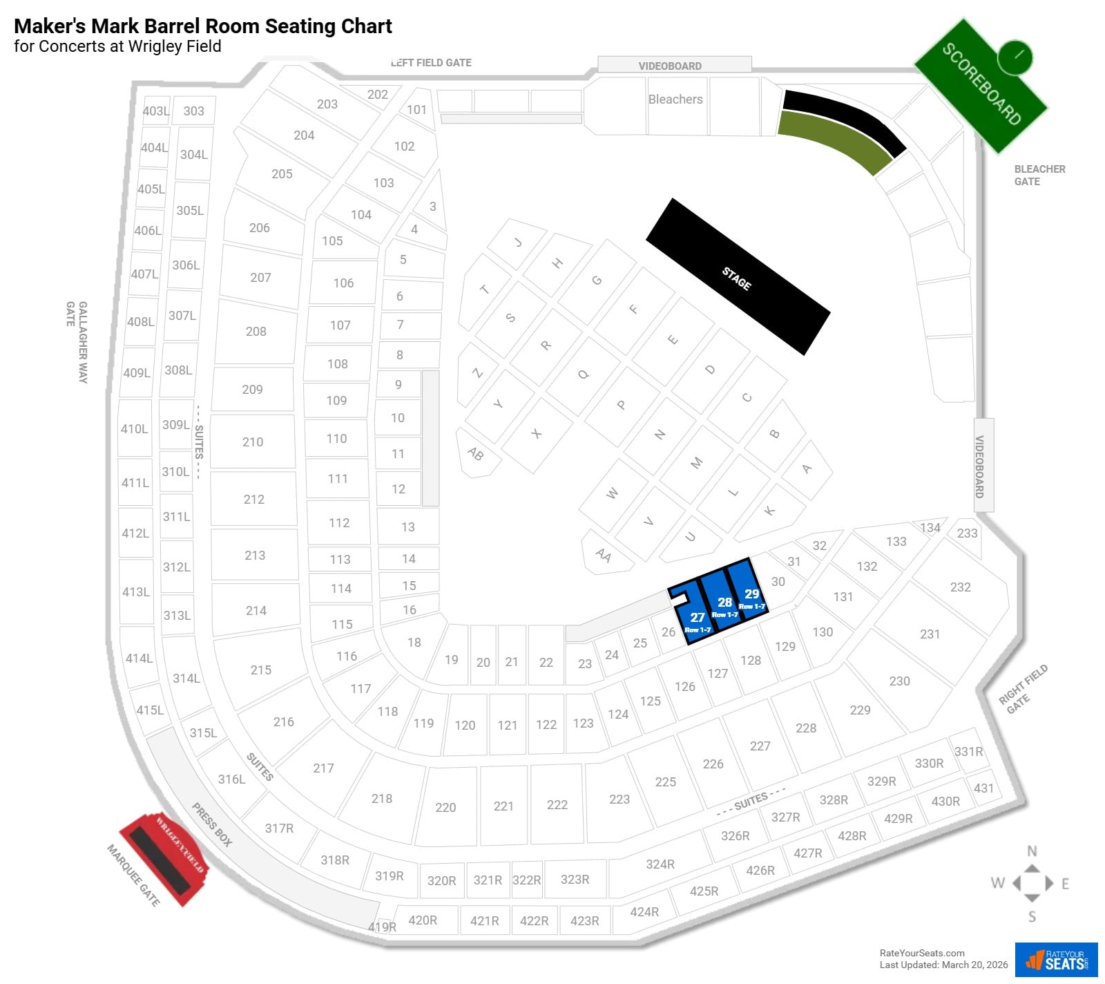 The Maker's Mark Barrel Room at Wrigley Field is a club located beneath the seats on the first base side. Fans with tickets in rows 1-7 of sections 27-29 will have access to this old-school speakeasy-like club lounge.