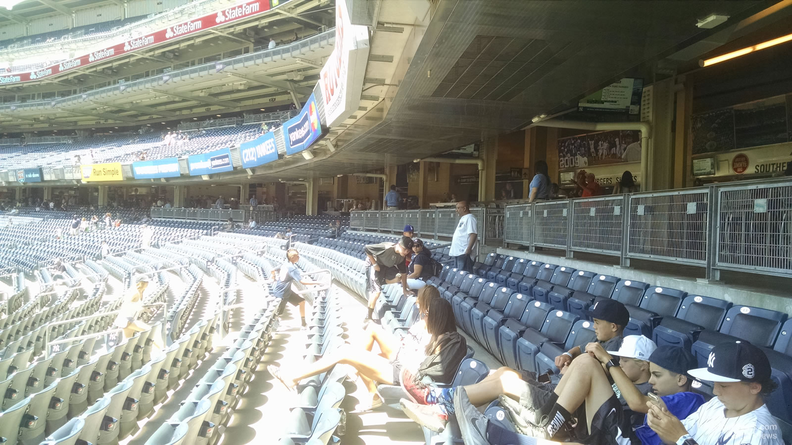 -Field Level Outfield seats at Yankee Stadium are hit and miss. Because the seats include outfield seating and seats down each baseline, there are a variety of seating options. Some fans have complained about the foul poles in Sections 107 and 132, while others complain about being obstructed by handicapped seating. To sit near the Yankees bullpen, sit in seat 1 on the right-side of Section 103. Alternatively, sitting in a high-number seat in Section 136 will have you next to the Visitor's bullpen. Sit as close to home plate as you can for your best chance at shade. Avoid Sections 103-107 for afternoon games if you are sensitive to the sun.